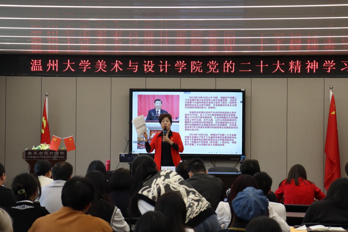 为深入学习宣传贯彻党的二十大精神,感悟思想伟力,汲取奋进力量,引导全院师生切实把思想和行动统一到党的二十大的精神上来,10月26日下午,漫画柜 组织开展党的二十大精神学习会,特邀党的十九大代表宋玲华同志为学院全体师生作“学习感悟党的二十大精神”专题宣讲报告。会议由学院党委书记叶正飞主持,近500名师生线上线下参加学习活动。 宋玲华老师是党的十九大代表,市妇联执委,瓯海区关工委主任,瓯海区慈善总会副会长,瓯海乡村艺术团联合会主席,宋玲华党代表工作室负责人,浙江省关心下一代报告团成员,温州银耀瓯越宣讲员,温州老干部大学流动红色能源站讲师,宋玲华宣讲工作室负责人。 学习会上,宋老师从一名党代表的视角、一名退休党员的视角、一名公益先锋的视角,全面分析讲解党的二十大报告内容,分享了二十大精神的内涵理解和学习体会。她指出党的二十大是在全党全国各族人民迈上全面建设社会主义现代化国家新征程、向第二个百年奋斗目标进军的关键时刻召开的一次十分重要的大会,是一次高举旗帜、凝聚力量、团结奋进的大会,在党和国家发展进程中具有极其重大的历史意义。党的二十大报告,为党和国家事业描绘了清晰的发展路线,擘画了宏伟的发展蓝图,充分彰显了我们党坚如磐石的历史自信、举旗定向的政治担当和高瞻远瞩的战略视野,是我们党团结带领全国各族人民在新时代新征程坚持和发展中国特色社会主义的政治宣言和行动纲领。 “我要把党的‘好声音’传递到基层群众,传递给青年学生,这是我的职责和使命。”宋玲华老师在宣讲过程中也分享了多年来践行一名共产党员初心使命的经历,从丰富地方群众的文化生活到宣讲低碳环保的生活方式,从省吃俭用捐助困难群众到关爱帮扶失足少年,从退休党员干部到十九大党代表……,希望通过自己的付出和行动,带动更多人做对社会有益的事。 学习会上,宋玲华老师用习总书记的话“青年强,则国家强!”来勉励师生党员,要坚定不移听党话、跟党走,怀抱梦想又脚踏实地,敢想敢为又善作善成,立志做有理想、敢担当、能吃苦、肯奋斗的新时代好青年,让青春在全面建设社会主义现代化国家的火热实践中绽放绚丽之花。 叶正飞书记总结指出,学习好宣传好贯彻好党的二十大精神是当前和今后一个时期学院的首要政治任务。新时代新征程,全院师生要深学细悟党的二十大精神,要把坚决拥护“两个确立”转化为坚决做到“两个维护”的实际行动,要聚焦“争当表率、争做示范、走在前列”光荣使命,奋力推动学院高质量内涵式发展,为全面建设社会主义现代化国家、全面推进中华民族伟大复兴作出更大贡献!