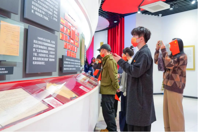 忆往昔峥嵘岁月,筚路蓝缕、栉风沐雨,不变的是鲜红的旗帜,不变的是华夏儿女赤诚的初心。移步至国旗诞生厅内,讲解员向大家讲述了设计者曾联松从缘起到邂逅、与五星红旗之间的故事。通过五星红旗诞生的故事,党员重温了国旗的设计理念。了解国旗的制作、国旗的涵义、国旗的标准等内容,感受“一旗、一人、一馆、一城”的情缘。