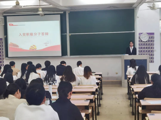 会议开始,主持人郑淇宣布本次答辩会的议程和相关要求。44位发展对象候选人依次通过PPT进行个人陈述,主要汇报入党动机、对党的认识、被列为入党积极分子以来的思想、学习、工作、生活等方面情况以及自身存在的不足与问题等。