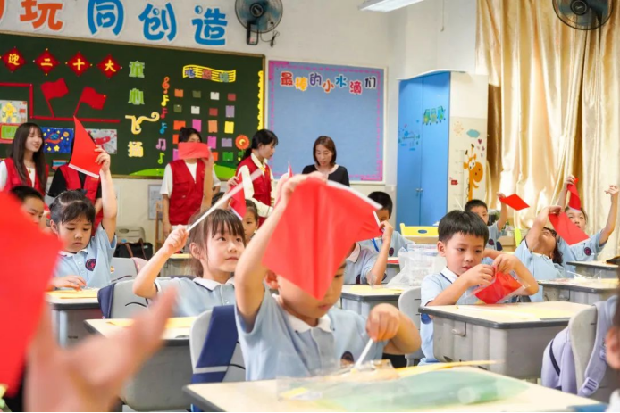 温大美院“童画”志愿服务队走进温大附校,开展“五星红旗,我为你自豪”主题活动。孩子们了解国旗背后的故事,亲手制作国旗,与国旗合影,向祖国母亲深情告白!
