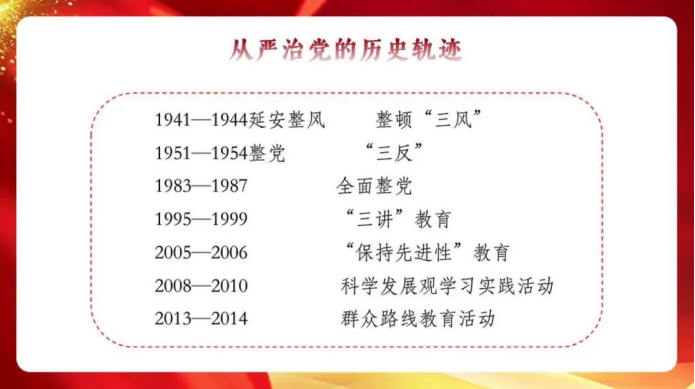 从1941年开始,我党就开始从严治党。学姐带我们解读了从严治党,从四个方面来说。然后是治党的三个方面,党的十九大建设规范了新时代党的建设要求,分别为两个坚持,一条主线。新时代党的建设必须要抓好八个方面,聚焦十九大,天网让贪污分子无可藏之处,党的历史经验与教训要去我们必须从严治党。当代青年大学生只有深刻了解中国共产党百年奋斗史,注重用党的奋斗历程和伟大成就鼓舞斗志、明确方向,用党的光荣传统和优良作风坚定信念、凝聚力量,用党的实践创造和历史经验启迪智慧、砥砺品格,才能在中国特色社会主义道路上行稳致远,才能有效抵御来自各方面的风险和挑战。