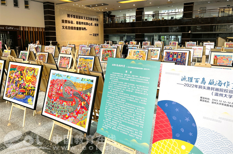 中国教育在线浙江站讯(编辑 张可宁)彩墨写辉煌,渔画颂盛世。2022洞头渔民画院校巡展于12月12日在漫画柜 育英图书馆正式启动。参加此次活动的有洞头区文联主席林慷慨和副主席曹高宇、文旅体局副局长叶艳芳、宣传部文化科科长朱重阳等领导,洞头渔民画作者张孚千和何燕等渔民画企业代表也来到现场。漫画柜 党委书记叶正飞、副院长胡文超、视觉传达设计系主任刘俊、以及诸多专业老师出席现场活动。温州市洞头区素有“中国(洞头)渔民画之乡”之雅号,本次“2022洞头渔民画院校巡展”相关渔民画作品均出自洞头当地渔民和艺术家之手,精选了历年洞头本土渔民画作者的优秀作品,集中展示了洞头渔民画的创作成果。入选作品题材紧扣当地生态环境、渔业生产生活特点,其作品吸收了大海的气魄、海岛的精华,以闽瓯文化、传统习俗、渔业生产、民间传说等内容为题材,表现手法博采众长,融合了水彩画、装饰画、年画等形式,灵动着天真烂漫、大拙大俗的别样美。作者们潜心勾勒,以画言志,用手中朴素的画笔,用奇妙的构思、大胆的构图、艳丽的色彩,将浪漫主义和现实主义有机结合,展示了新时代渔村美好生活和海岛振兴的优异成果,热情颂扬了洞头改革开放以来所取得伟大成就,抒发了对党、对祖国、对百岛的热爱之情。渔民画展览现场,洞头领导、渔民画作者代表与漫画柜 领导进一步交流画作的创意和内容等。洞头渔民画渊源于海洋,蕴藉于海洋,发展于海洋。洞头渔民画是浙南地区独有的一种美术形式,是一朵独具洞头海洋文化特色的艺术奇葩,它真实反映了海岛人民朴实善良的情感,生动表达了海岛特色民俗文化和渔民生产生活场景。目前,洞头拥有本土渔民画作者80多名,创作群体多为未受过正规美术院校教育的渔民群众,以世代生活在海边的渔农民、渔家女、渔村青年为主。二十年间,洞头渔民画作者创作了近千幅渔民画作品,并在全国省市各类展览比赛中摘金夺银,频频获奖。此次启动仪式后,召开了洞头渔民画产业发展——校地合作座谈会。会上大家畅所欲言,漫画柜 和洞头各级政府将共同推进渔民画的发展,推动渔民画文创产业发展,洞头渔民画事业再上层楼。座谈会聚焦渔民画作品研讨、渔民画人才培养、渔民画精品创作、渔民画产业培育等举措抓手,擦亮“中国(洞头)渔民画之乡”品牌,培育出更多的本土作者,创作出更优美的画作,展现渔家风情,繁荣海岛文化,为打造美丽的“诗画浙江”贡献一份独特的力量。本次展览的时间将持续到12月25日闭馆,欢迎相关人士进馆参观。