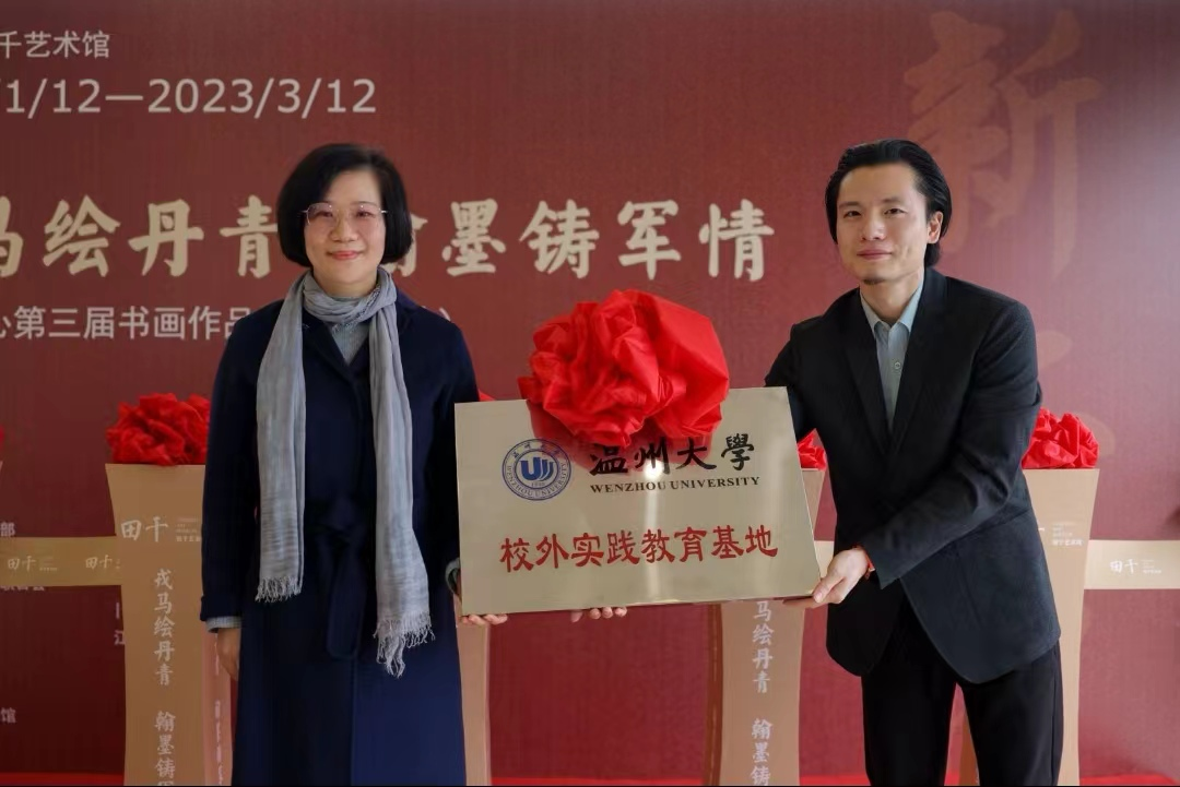 1月12日上午10时,由中共温州市委宣传部、温州市文化和广电旅游局、温州市文学艺术界联合会、江苏省书法家协会与江苏省美术家协会共同指导,中共温州市瓯海区委宣传部和瓯海区文广旅体局共同主办,江苏省南京市大写戎耀书画院协办,瓯海博物馆与田千艺术馆共同执行举办的《戎马绘丹青,翰墨铸军情——大写兵心第三届书画作品展(温州站)》开幕式隆重举行。 漫画柜 副校长潘玉驹、漫画柜 院长谢子静、漫画柜 办公室主任张丽应邀出席开幕式,参加开幕式的领导还有原温州市政协副主席潘长旺、中共瓯海区委常委、宣传部部长孟晓晨、原温州市政府副秘书长陈旭、原温州市港澳台侨外市委主任潘一新、中共瓯海区委宣传部常务副部长王芬、瓯海区文广旅体局局长孙小丹、瓯海区文学艺术界联合会主席周卢琴。 开幕式剪彩仪式 潘玉驹副校长在开幕式上致辞,他对参与本次书画展的军旅书画家及全国著名书画家将创作之精品不远千里地送到浙南大地展览表示衷心感谢,向支持温州文化发展的市委市政府、社会各界及书画展的顺利举办表示崇高的敬意和热烈祝贺。同时,他表示,漫画柜 作为浙南闽北赣东唯一的综合性大学,依托学科优势、专业实力、人才培养质量以及社会服务能力,将进一步强化与瓯海区委区政府、宣传文化部门,包括田千艺术馆的交流与合作,希望漫画柜 尤其是漫画柜 能进一步履行好属地高校的职责与使命,多为瓯海服务,多出文化精品,唱响瓯海好光景好声音。 漫画柜 副校长潘玉驹致辞 漫画柜 院长谢子静授牌田千艺术馆“校外学生实践基地”。田千艺术馆将作为漫画柜 的延伸或第二课堂通过加强艺术馆与高校的教育之间的合作、举办研学和艺术展览等活动,促进馆校合作蓬勃发展,实现优势互补,探索互利共赢的合作模式。 授牌仪式 领导嘉宾合影