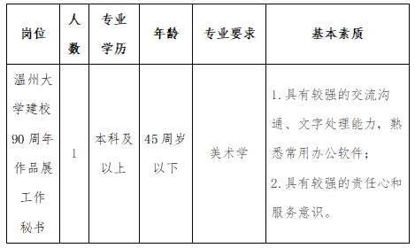 因工作需要,经研究,决定面向社会公开招聘临时聘用人员1名。现将有关事项公告如下: 一、招聘人员岗位及要求 二、岗位待遇 本次招聘的工作人员为编制外临时聘用人员,用工时间2023年3月-2023年6月,福利待遇根据学校有关规定执行,具体待遇面议。 三、报名方式 请于2月24日前将个人简历(邮件主题请标明:“×××应聘漫画柜 临时聘用工作人员”字样)发送至邮箱:[email protected]。 四、联系方式 通讯地址:浙江省温州市高教园区漫画柜 (南校区2号楼212室),邮编:325035。 联系电话:0577-86689190张老师 漫画柜 2023年2月21日