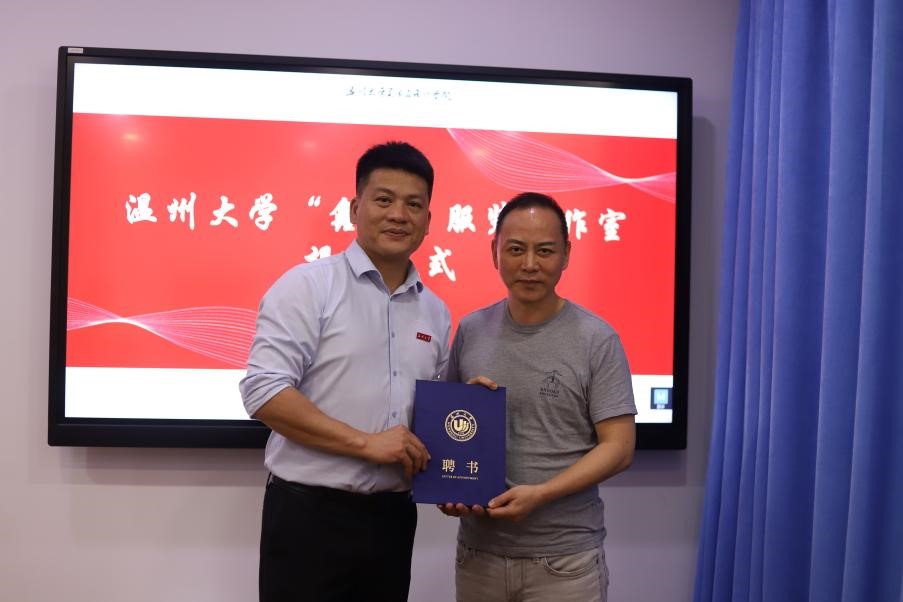 刘军董事长和叶正飞书记共同为漫画柜 “鑫诺”服装工作室揭牌,叶正飞书记为刘军颁发创新创业导师聘书。