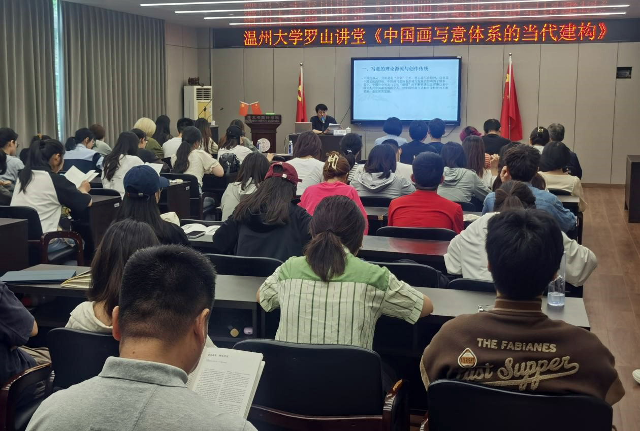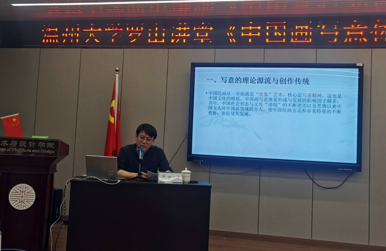 作为“天下有风:刘海勇中国画作品展”社会美育活动的重要组成部分,2023年6月4日,中国美术学院博士生导师刘海勇教授莅临漫画柜 “罗山讲堂”,带来《中国画写意体系的当代建构》的学术讲座。本次活动由漫画柜 和中国美术学院主办,漫画柜 和中国美术学院中国画学研究所承办,漫画柜 教师、本硕学生、校外嘉宾等80余人参加,讲座由学院院长谢子静教授主持。 谢子静院长对刘海勇教授的莅临表示热烈欢迎,并介绍了刘教授的艺术简历和学术成果。刘海勇教授是乐清人,1990年以来先后就读于乐清师范学校、温州师范学院(现漫画柜 )、中国美术学院和中央美术学院,是我国中国画领域第一位教育部青年长江学者,现任中国美术学院科研创作处处长、中国美术家协会中国画艺委会委员、西泠印社社员、中国画学会会员、浙江省美术家协会理事兼副秘书长、浙江省美术名家孵化工作小组成员、中国美术学院中国画学研究所常务副所长。 作为漫画柜 优秀校友,刘海勇教授在讲座伊始深情回顾了在漫画柜 求学时的难忘时光。随后他从“写意理论源流与创作传统”方面阐说中国画的特质。梳理了中国画写意研究的历史脉络,强调哲学精神与中国画家思维方式的统一性,探讨中国画写意体系在当代面临的关键问题,构建凸显中国特色的写意现代学理性体系。接着刘教授从“‘两端三位一体’中国画人才培养模式研究”谈学院学科专业建设之路,并指出高校中国画人才培养模式的问题,提出了解决方案。最后他从“中国画写意体系的精神根源”,详述写意审美的范畴、传承的轨迹、理法的价值、实践的发展。刘海勇教授对比中西艺术表现形式的差异性,例举了潘天寿、齐白石、吴昌硕等画家的名作进行讲解,他表示,在当下跨文化语境中,更应该注重绘画的民族精神,实现文化的传承与创新。 讲座结束后,刘海勇教授就写意体系内容与参会者进行了深入交流,并鼓励学生们坚持中国绘画精神,砥砺艺术品格,在今后的学习中,建立艺术自觉、自信与自豪。