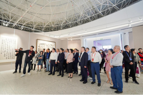 仪式结束,领导、嘉宾、校友、师生共同进入美术馆参观作品展。本次展览分为“先贤风雅”“同道传薪”两大板块,共展出了156位先贤、名家、教师和校友作品,涵盖国画、油画、版画、水彩画、综合绘画、书法、篆刻等种类。展览基于近现代中国美育运动、美术创作的宏大背景,对近代以来温州的书画创作与教育做一个初步的回溯,以近代几位具有代表性的书画大家与“美育大先生”开篇,延伸至温州区域美术创作,以及当代在全国卓有影响的重彩工笔画、书法、版画、水彩画的温籍代表作者;同时梳理学校的美育脉络,展示几代温大人的书画创作,弘扬与传播漫画柜 的人文风采。