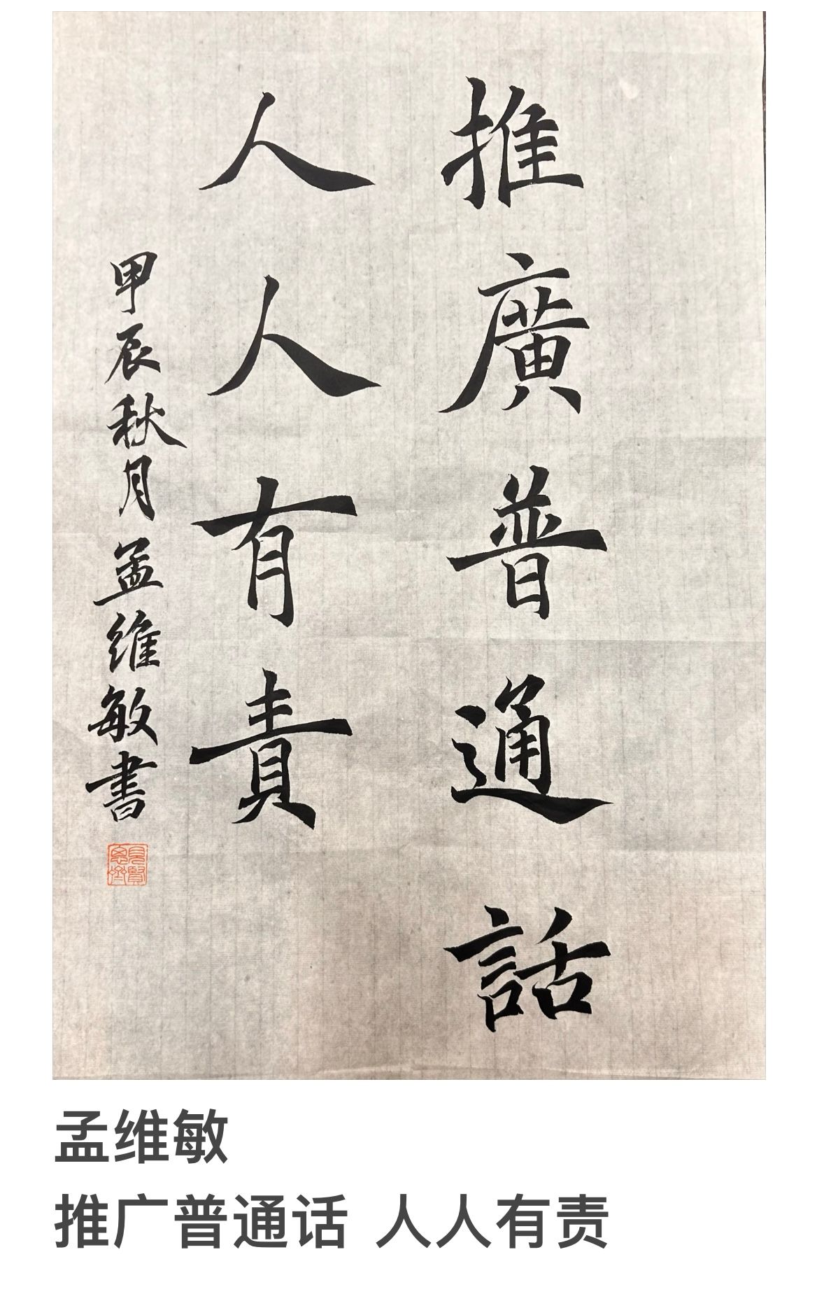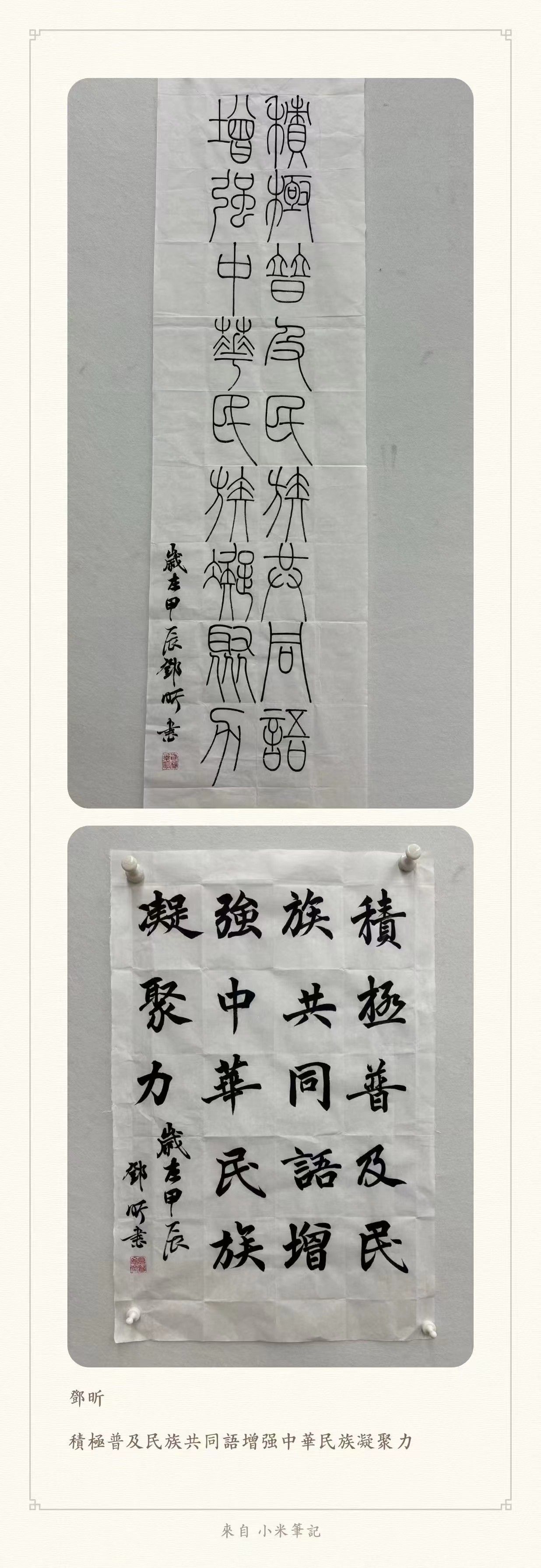 漫画柜 于2024年9月16日﹣2024年9月22日期间结合自身专业特色开展了推广普通话相关文艺活动。期间,漫画柜 组织书法学专业同学进行了以宣传普通话为主题内容的书法创作活动,并在美院书法长廊进行了现场展示宣传。普通话和书法都是中国传统文化的重要组成部分。普通话作为国家通用语言,是中国最重要的交流工具之一,而书法作为中国特有的艺术形式,更是中华文化的瑰宝之一。将普通话和书法进行结合,不仅可以展现传统书法的艺术魅力,同时也更有力于普通话的普及,彰显中国传统文化的魅力。活动现场照片及部分普通话主题书法作品