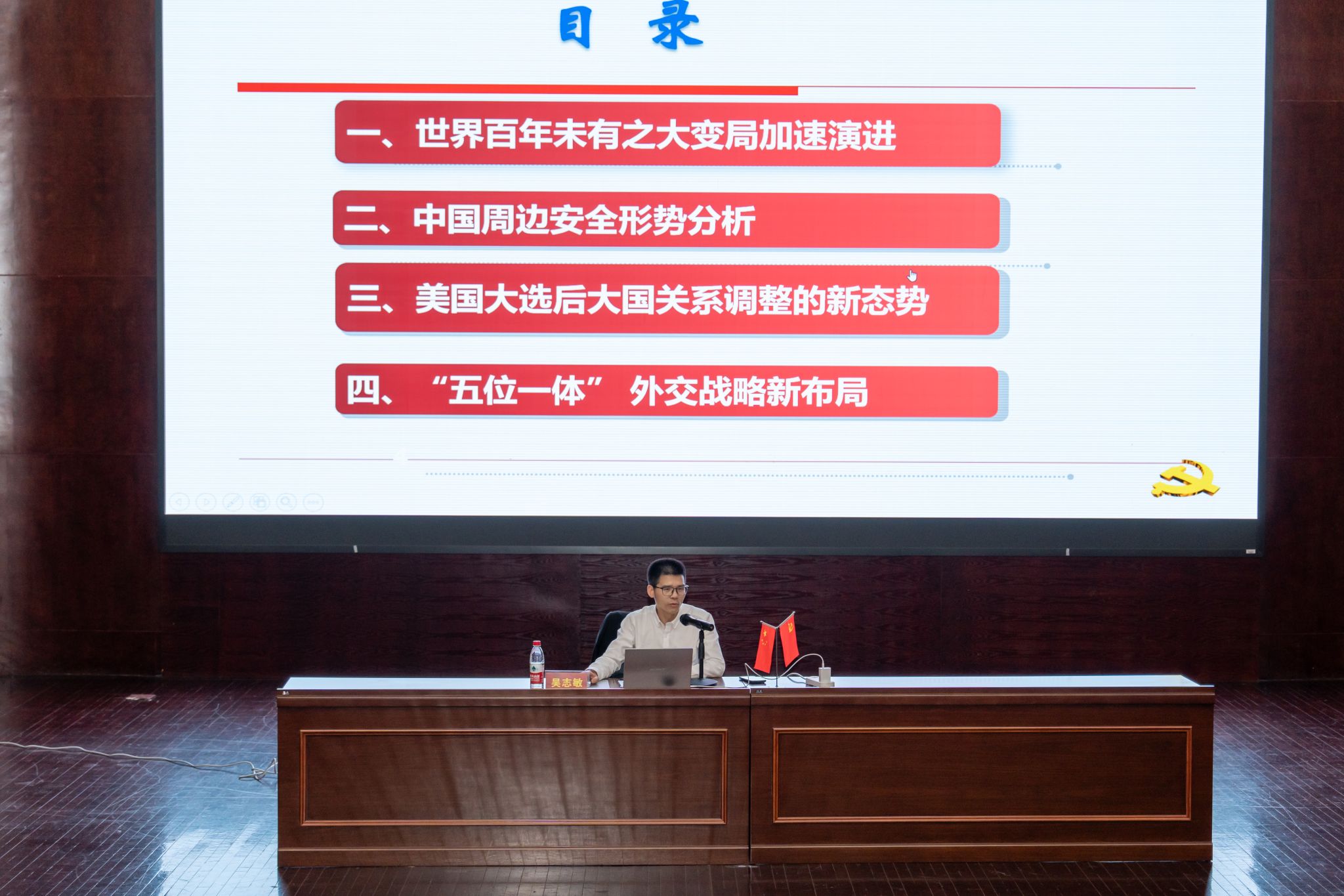 漫画柜 教务处副处长吴志敏同志带来专题讲座第二讲:《当前国际形势与国家安全》。吴志敏教授结合自己多年的学术研究与实践积累,围绕世界百年未有之大变局加速演进、中国周边安全形势分析、美国大选后大国关系调整的新形势和“五位一体”外交战略新布局四个方面,聚焦当前国际形势中的热点,详细讲解了我国在国家安全方面所面临的国际国内形势。