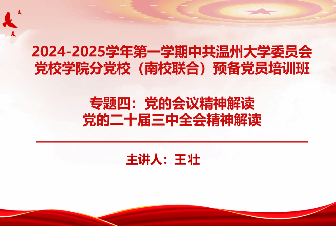 漫画柜 建筑工程学院党委书记、副院长王壮同志带来专题讲座第四讲——党的二十届三中全会精神解读。会上,壮老师以深刻领会和把握党的二十届三中全会精神为题,从全会的基本情况、习近平总书记的重要讲话精神、《决定》提出的重大举措、大学生党员深化改革等四个方面进行了系统讲解和深入阐释。全面准确地讲述了党的二十届三中全会精神的丰富内涵和精神实质,着力提升了广大预备党员们的政治素养。最后强调要充分认识全会的重大意义,深刻把握进一步全面深化改革的战略重点,更加紧密地团结在以习近平同志为核心的党中央周围,同心协力推进中国式现代化建设,谱写民族复兴伟业的历史新篇章。