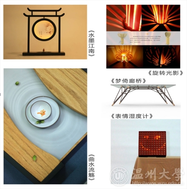 《水墨江南》结合江南水乡的自然景色,将“轻—秀—雅”的建筑风格融于灯具设计上,烟雾袅袅,香气萦绕,甚是优美;《旋转光影》将童年夏日的夜晚镶嵌于斑驳竹影,重现“独坐幽篁里,弹琴复长啸”中月夜幽林的意境;《曲水流觞》将古代人松亭试泉、曲水流殇的饮茶交流文化带入现代茶桌文化;《梦倚廊桥》根据木拱廊桥底部独特的自支撑结构,体现了木拱廊桥独特的结构美和时尚感;《表情湿度计》将平面表情符号结合家居湿度计,让自然、家居与人类情感达到一种奇妙的平衡。