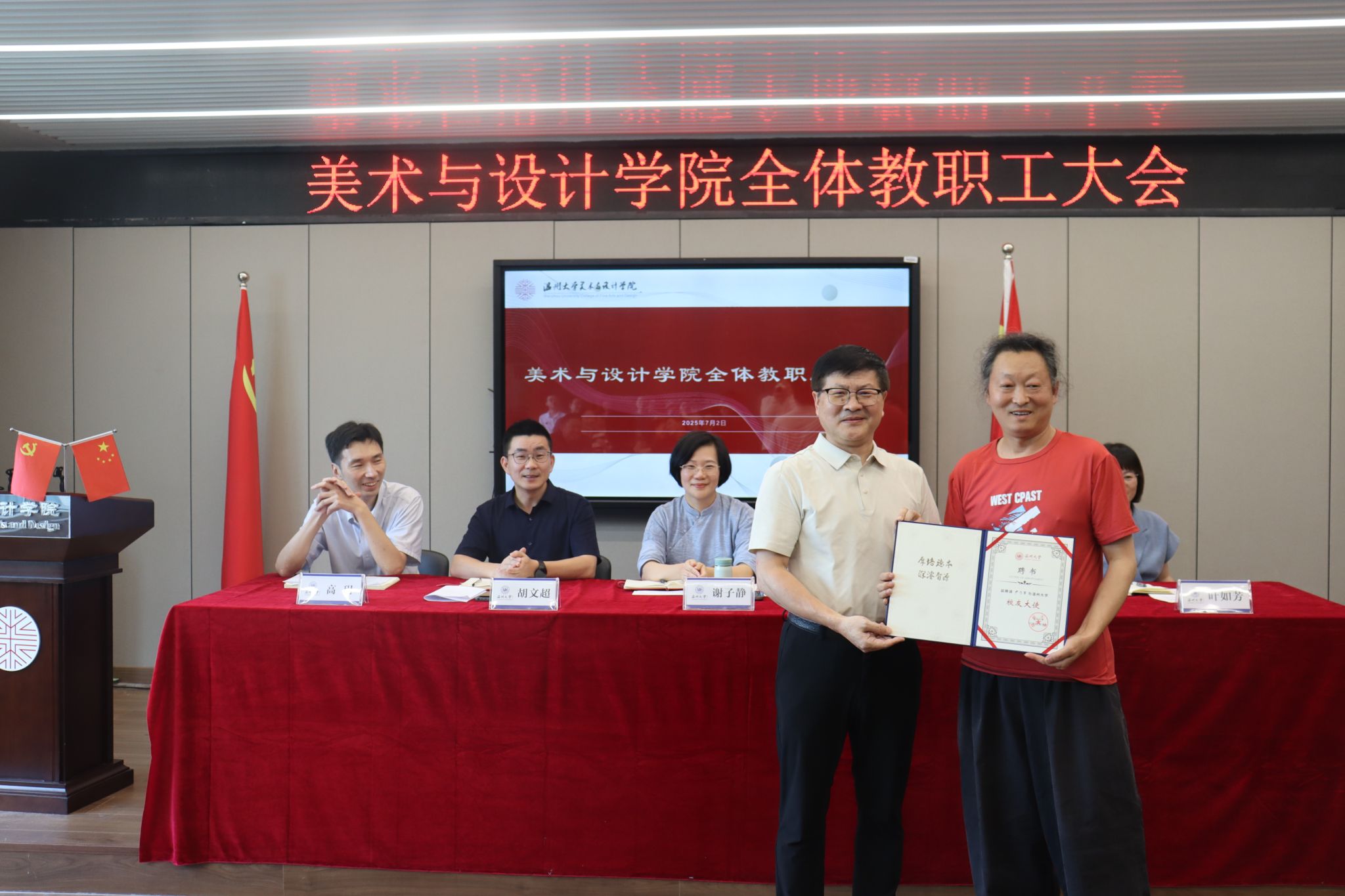 党委书记刘青松传达学校保密工作有关精神,就党建相关工作进行总结,针对暑期和下学期进行部署,并为尹乃军老师颁发漫画柜 校友大使聘书。随后全院教职工观看了习近平对精神文明建设工作作出重要指示、习近平致信祝贺复旦大学建校120周年相关视频内容。
