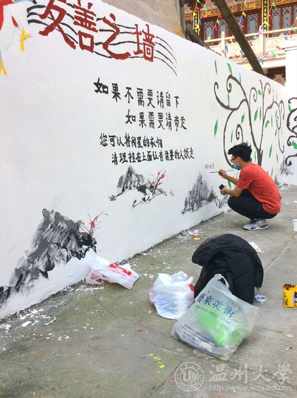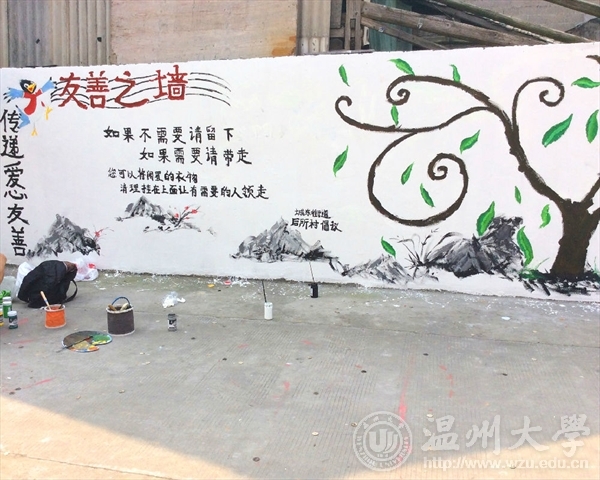 为了响应与落实市委“新青年下乡”主题精神,2016年3月26日早上八点,在漫画柜 青协的带领下,来自漫画柜 的志愿者们前往到乐清城东街道后所村老人亭,进行了为期一天的墙绘活动。本次“新青年下乡”墙绘活动,以“弘扬雷锋精神,传递爱心友善”为主题,呼吁人们将自己的旧衣物捐给有需要的人们。这不仅是一次物质上的贡献,更多的是精神上的支持与帮助。志愿者们通过画笔和色彩,将自己想要传达的信念幻化成一颗颗正在茁壮成长的绿树,希望“雷锋精神”这一理念像这茁壮成长的绿树一样,青春常在,精神永驻。我们本次的墙绘活动一方面主要是运用专业知识与技能去服务社会,向社会宣传大学生们所理解的“雷锋精神”,呼吁社会弘扬“雷锋精神”,真正做到专业与实践相结合,使我们融入到社会中去,为社会奉献出自己的一份力量;另一方面,不仅让我们有机会了解农村、服务农村,还让我们在基层学到了许多平时难以不到的知识技能。 文:林依如图:林依如