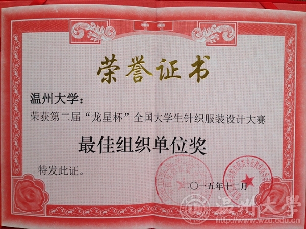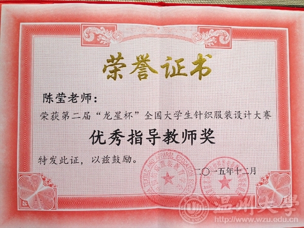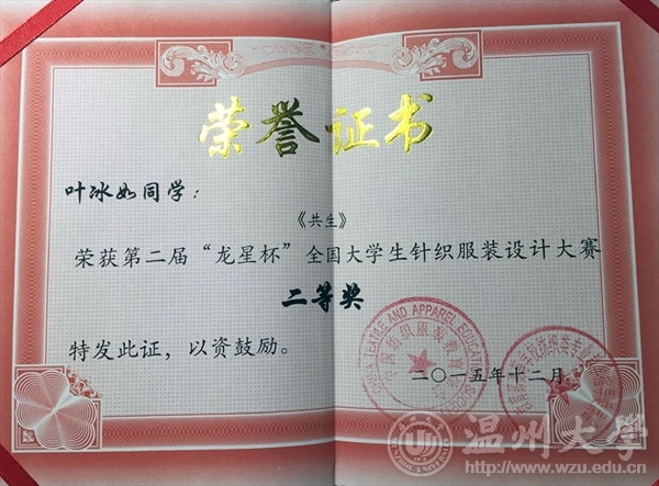 2015年12月13日,由教育部高等学校纺织类专业教学指导委员会和中国纺织服装教育学会主办、东华大学承办的第二届“龙星杯”全国大学生针织服装设计大赛颁奖典礼在东华大学举行。漫画柜 12服装设计班的5名同学在陈莹老师的指导下参赛并获奖项,其中,叶冰如的作品《共生》系列获二等奖、罗璇的作品《异构空间》系列获三等奖和朱芮萱的作品《迷雾》系列获三等奖,罗勇超、徐梦然作品获优秀奖。漫画柜 获优秀组织奖,陈莹老师获优秀指导教师。本次大赛以“新颖、时尚、舒适、横机为你插上创新的翅膀”为主题,旨在培养大学生的创新精神和实践能力,发掘我国针织服装类设计人才。大赛于2015年3月开始启动,全国各纺织服装院校积极参与。将课程成果延伸至专业赛事,引导和鼓励学生将课程作品走出校门、亮相各类大赛,接受同行审阅和市场竞争,既是对学生专业学习能力和学习效果的检验,更是对专业课程教学效果的大考验。这是《针织服装设计与工艺》课程在2015年继参加第八届中国(大朗)毛织服装网上设计大赛,李温诗、夏婷、陈丽莎三位同学获得入围奖后的又一丰硕收获。