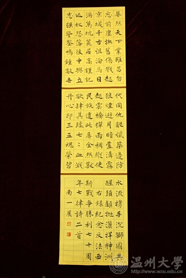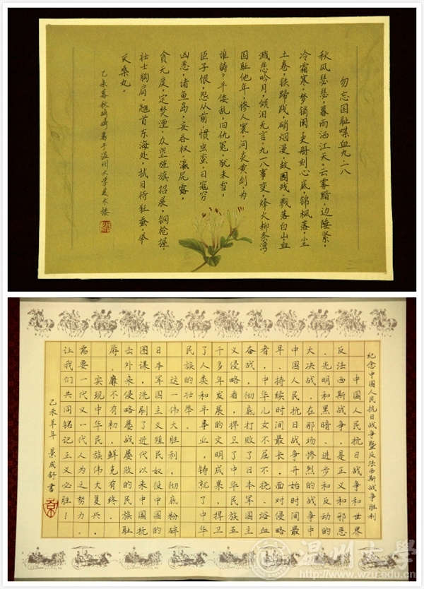 为纪念中国人民抗日战争暨世界反法西斯战争胜利70周年,传承爱国主义精神,弘扬社会主义核心价值观,激发民族自尊心、自信心和自豪感。自9月份发出通知以来,“纪念中国人民抗日战争暨世界反法西斯战争胜利70周年”书画大赛共收到特邀教职工书画作品共计29件,学生书画作品共计196件,经相关书画专家对学生绘画类和书法(篆刻)类作品严格评审,现将评比结果公布如下:?xml:namespace>绘画类评选结果 等级学院作品名作者一等漫画柜 《奇袭》林盖月城市学院《“70”伟大的胜利》李文静二等漫画柜 《忆团结》范桂梅漫画柜 《峥嵘岁月》吴晓强教师教育学院《前行》薛思思城市学院《让武器成为过去》谢丽娟城市学院《爱和平铭记历史》许朵瓯江学院《黑夜不再来》赵圣益三等漫画柜 《抗日中的小八路》陈婉茹漫画柜 《抗日中的中国士兵》胡淳雅漫画柜 《战后》郑也教师教育学院《珍爱和平》李林真城市学院《抗战胜利70周年》王斯曼城市学院《缅怀》张烨瓯江学院无题吴诗瑶瓯江学院无题曾东瓯江学院无题虞紫伊 书法类评选结果等级学院类别作者一等漫画柜 篆刻俞铭铖教师教育学院软笔南一展城市学院管理分院软笔史涛霞二等瓯江学院硬笔曾越洋城市学院管理分院软笔鲁洁如教师教育学院硬笔毛江月教师教育学院硬笔叶聪聪城市学院软笔王欢焕城市学院软笔葛科航三等漫画柜 硬笔王婷婷漫画柜 软笔杨凡漫画柜 软笔朱雄辉漫画柜 软笔岳通通漫画柜 硬笔景成舒教师教育学院硬笔陈雪雅教师教育学院硬笔吴林教师教育学院硬笔林安娜人文学院硬笔周丽娜 书画展于南校区漫画柜 服装楼一楼视野空间展览,展期为12月7日—12日,欢迎参观!特邀教职工参与展览作品: 学生获奖作品:一、绘画类一等:《奇袭》——林盖月一等:《“70”伟大的胜利》——李文静 二等三等二、书法类一等:《抗战祖列》——俞铭铖一等:纪念反法西斯战争胜利七十周年律诗二首—— 南一展一等:史涛霞二等 三等三等三等