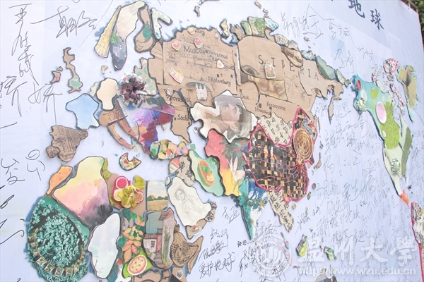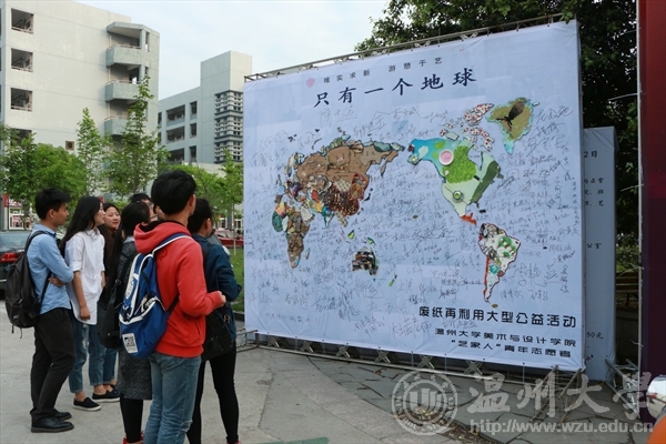 在第41个世界地球日来临之际,在“七十亿人的梦想: 一个地球,珍惜地球资源,转变发展方式,倡导低碳生活”的呼吁下,4月21日,漫画柜 “艺家人”青年志愿者协会在美院楼举行了“乐行于艺,环保于己”地球日废纸再利用公益活动。 此次活动,旨在借助地球日活动平台提高公众对地球资源的认识,引导全社会积极参与节约集约利用资源、减少碳排放、促进经济发展方式转变的实践。为此,在今天的活动现场,设置了主题展览,废纸上作画,签名等活动。志愿者们在废弃的报纸,电池,矿泉水瓶等上面作画,一件件精美新奇的艺术作品应运而生,又将作品“画”成也一副巨大的世界地图,别有一番风味,让在场的学子们连连称赞,并纷纷在喷绘上进行环保宣言签名。 地球是人类共同家园,美院学子用自己专业技能变废为宝废,用绚丽的色彩,艺术的行动,倡导公众注意地球状况和人类活动对环境的危害,强调保护和改善人类环境的重要性,此次活动获得全校师生的共同认可和赞扬,并被温州都市报报道。通讯:刘子彰、摄影:孙彦鑫epaper.wendu.cn/Html/2015-04-22/12/content_5.html
