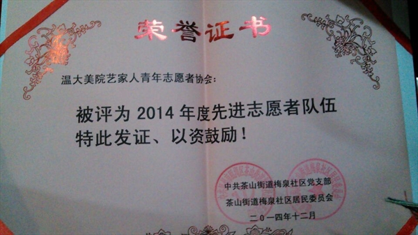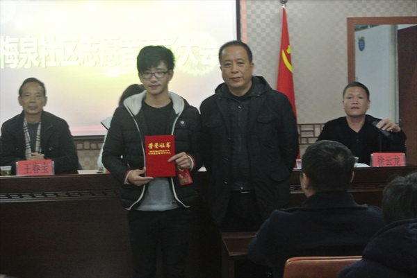 12月28日上午,梅泉社区居委会在道德讲堂开展了2014年梅泉社区志愿者表彰大会。此次大会由梅泉社区徐云龙委员主持,鲁建晓、王春宝、吴海燕等社区委员出席,漫画柜 “艺家人”青年志愿者协会,温州医科大学,漫画柜 城市学院,温州职业技术学院的志愿者参与此次表彰大会。 9点50分,志愿者表彰大会正式开始,首先是梅泉居委会为志愿者带来的一段小短片,为志愿者回顾了2014年以来的志愿者活动。丰富多彩的社区生活,快乐充实的志愿者活动......社区委员对各个志愿者团队进行颁奖,漫画柜 “艺家人”青年志愿者协会被评为“2014年度先进志愿者队伍”,这也是对我们“载梦小舟”支教的志愿者们这一年来辛苦付出的肯定。随后,各获奖志愿者团队代表一一上台发言,漫画柜 “载梦小舟”负责人代表张静同学也上台作了发言,总结“载梦小舟”这一年来的感想,对志愿者表达了由衷的感谢,对一直支持的社区负责人和家长,以及可爱的小朋友们表示感谢。最后,在梅泉社区居委会委员鲁建晓女士的演讲下,本次志愿者表彰大会圆满划上了句号。 回首漫画柜 “艺家人”青年志愿者协会与梅泉社区合办“载梦小舟”绘画班这几年所走过的路程,有感动,也有快乐,我们的支教活动也会一如既往地开展下去,为更多的人提供帮助,这就是志愿者的精神! (通讯/拍摄:刘子彰)