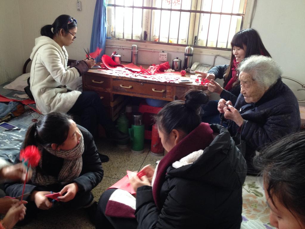 志愿者们分工有序,在精通瓯语的志愿者和老人亲切交流的同时,房间里的其他志愿者也开始了手工艺品的制作。红色的玫瑰花,粉红色的水仙花,可爱的“寿”字剪纸,没多久便在志愿者们的巧手上“诞生”了。志愿者们娴熟的技术也吸引了房间外其他老人的驻足围观,房间里房间外一片欢声笑语。在活动接近尾声的时候,志愿者将自己亲手做好的花一一送给了老人,并将各种象征美好寓意的剪纸贴在窗户上,在老人和志愿者们的依依不舍中,这次“送温暖”活动也落下了帷幕。
