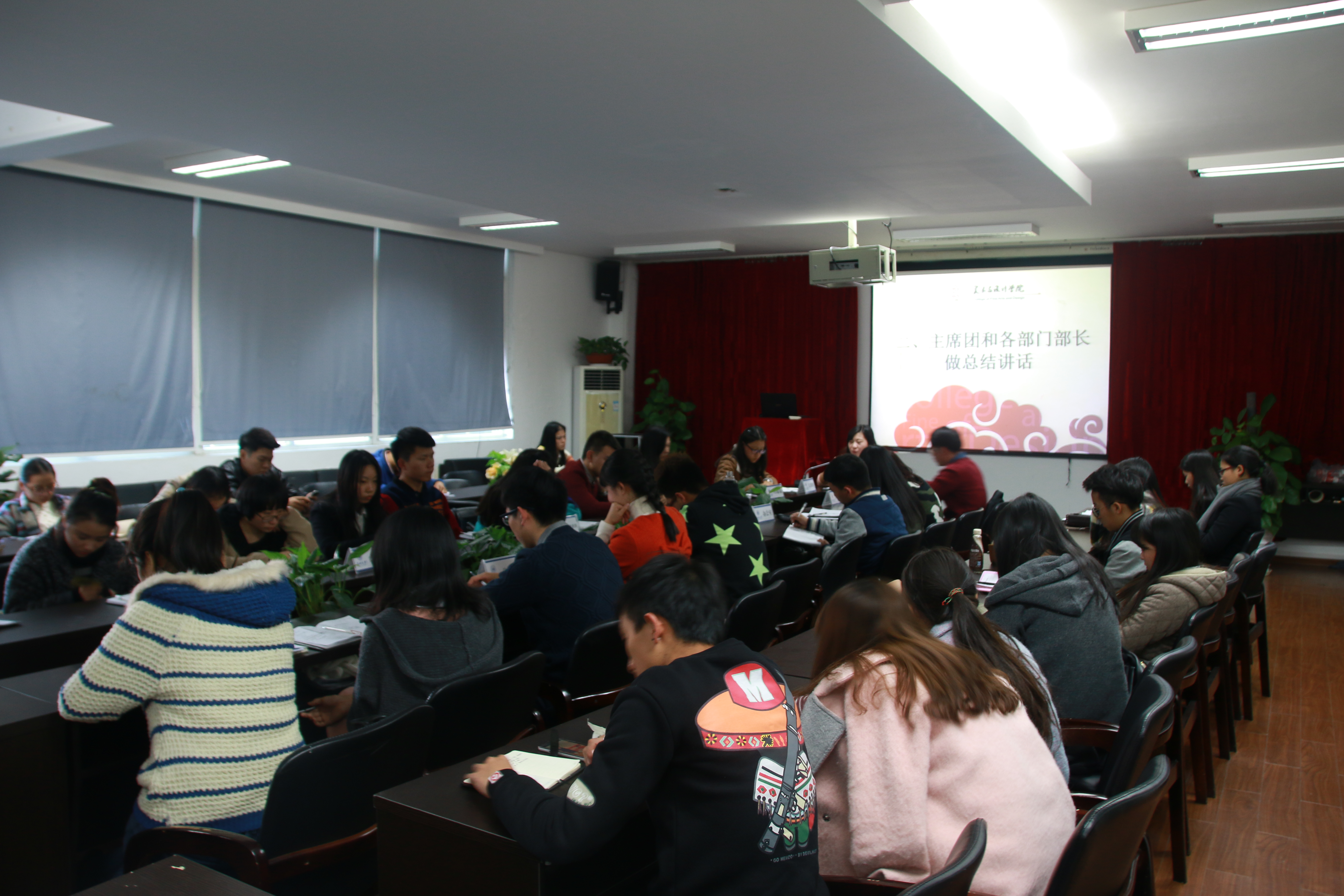 会议第二项是主席团和各部门部长做总结讲话。团委副书记金李斌说:“团学就像一只手,每个团学人就是手指,只有十指连心,才会力大无穷!”主席吴荣婷也从工作态度、配合程度、学习成绩等等方面细致讲解了优秀团学干部的考核制度。