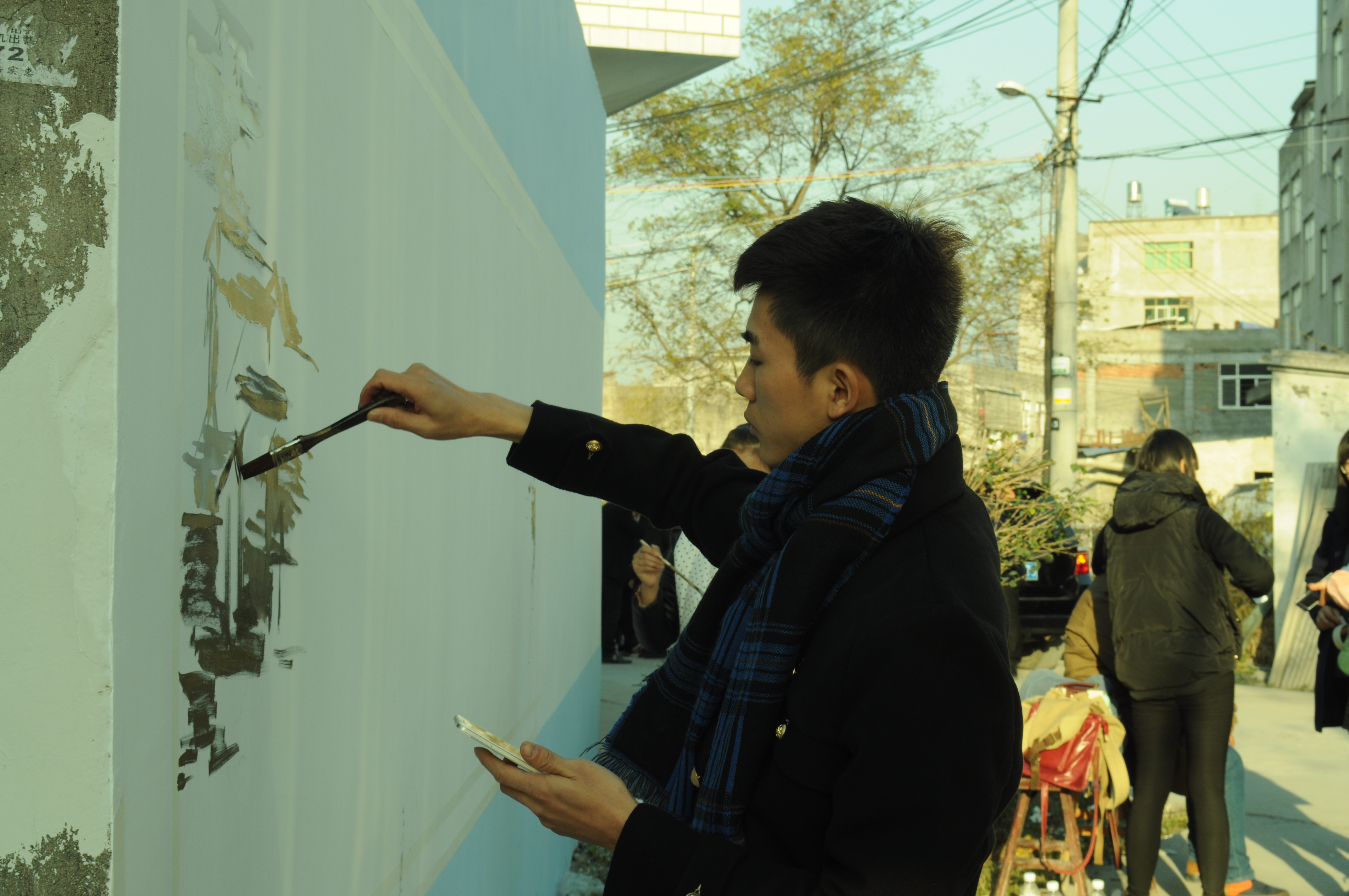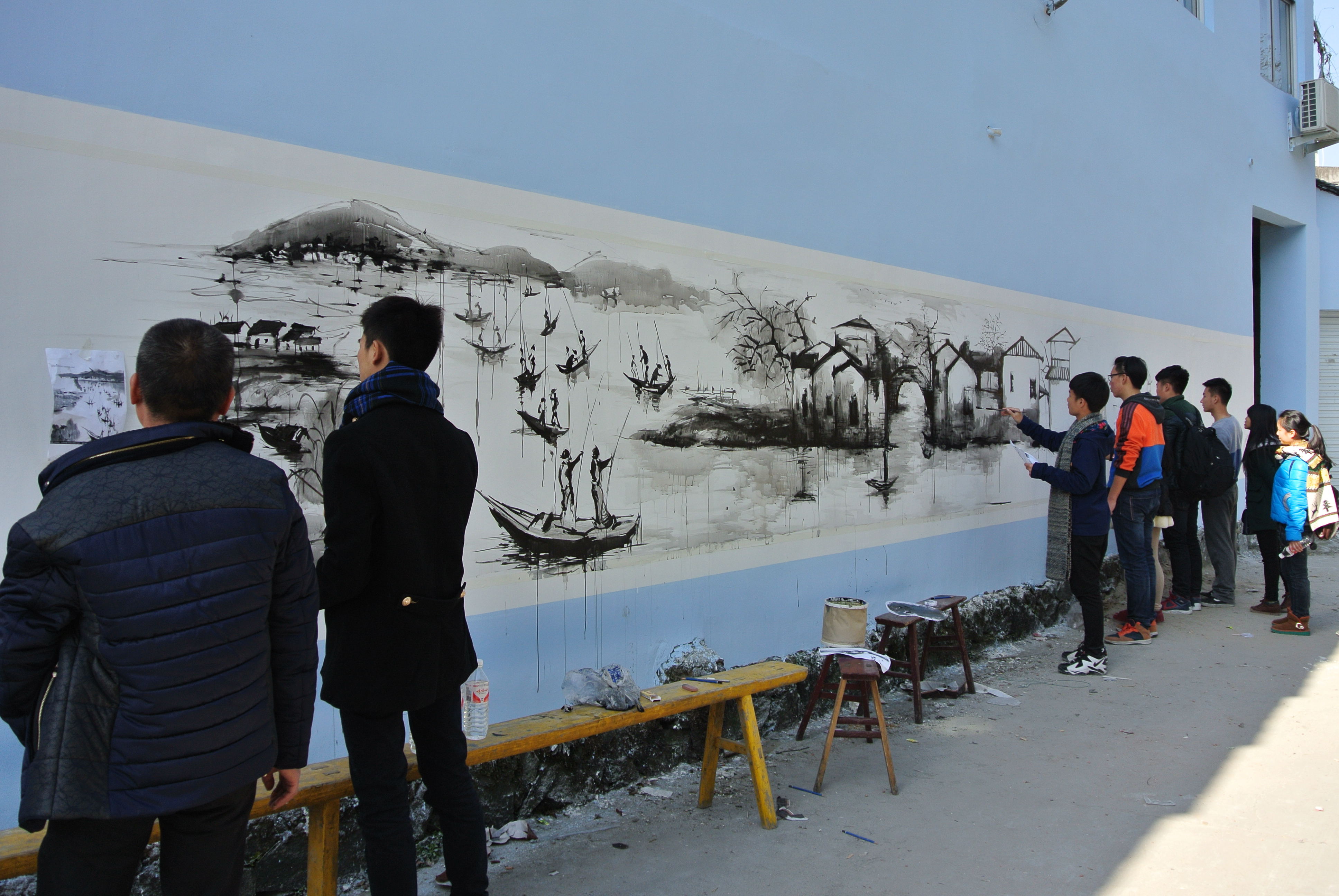 中午12点,志愿者在东边村村民热情款待下享用美味的午餐后,再次投身于上午未完成的画作中。在下午5时左右,600米的雪白的墙,在80余位志愿者的努力下终于穿上了美丽的新装。