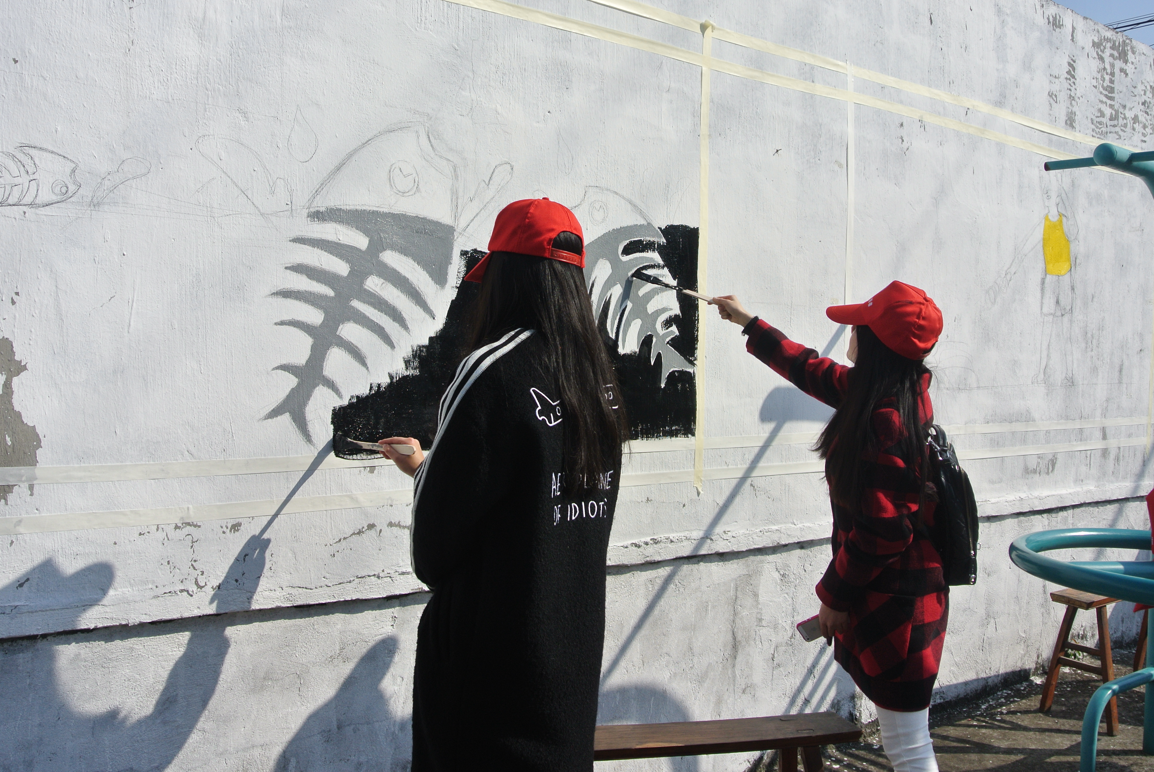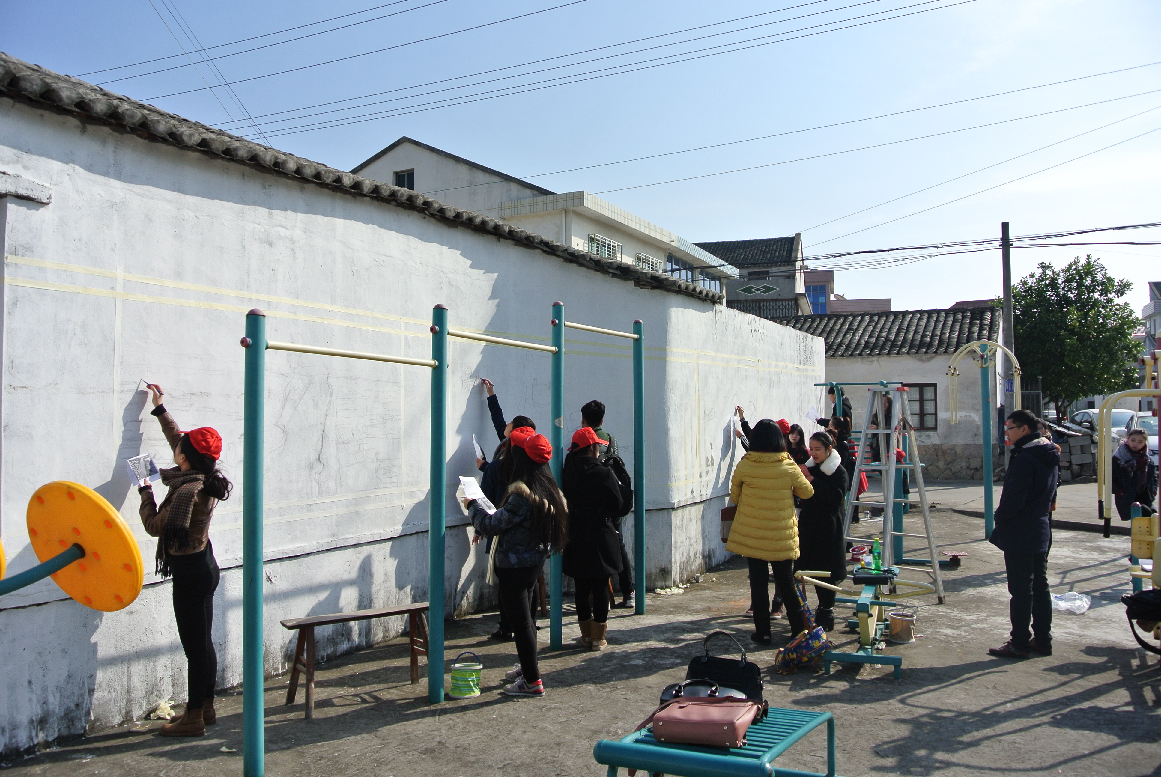 上午9:30,志愿者们经过近一个小时的奔波来到了鹿城区七都街道。志愿者们首先对墙体进行了考察,确定了墙绘大小后,用衣纹纸对边框进行了张贴。10:30,五面墙的框架在志愿者们的共同努力下全部贴好,由于有5面墙,志愿者以2-3人为一组分成5组后开始投入各自墙面的“战斗”,大家斗志昂扬。活动中,小组成员各组分工,有人负责打稿,有的人负责调色,有的人负责涂颜料,井然有序。志愿者们的动静也迎来了不少出来晒太阳的村民和小孩子的驻足围观,但并不知道志愿者们在做什么。随后志愿者便和村民们讲述了此次活动的主题和意义,村民们听完后才恍然大悟,并对我们的墙绘和行动表示做出了肯定。