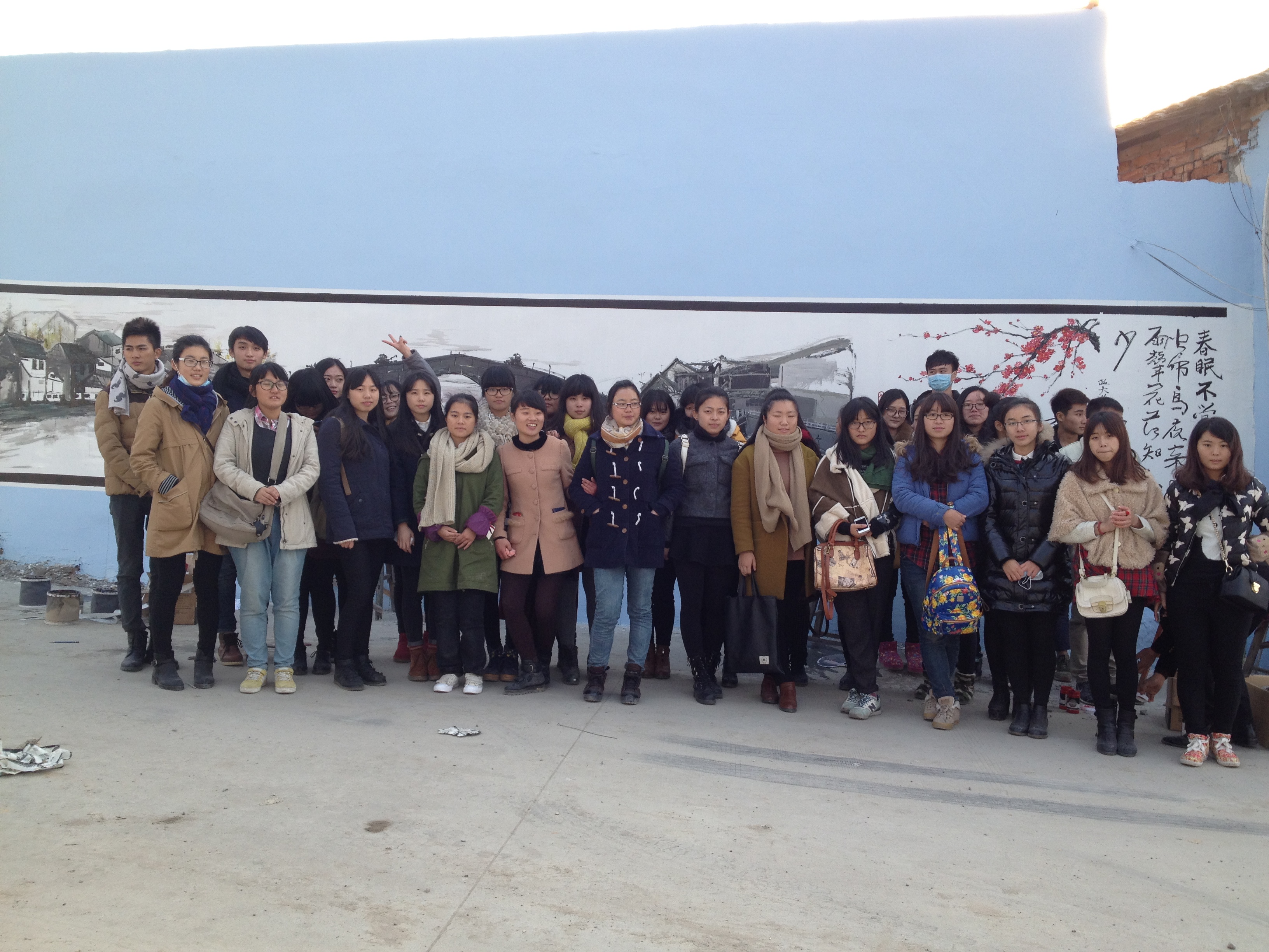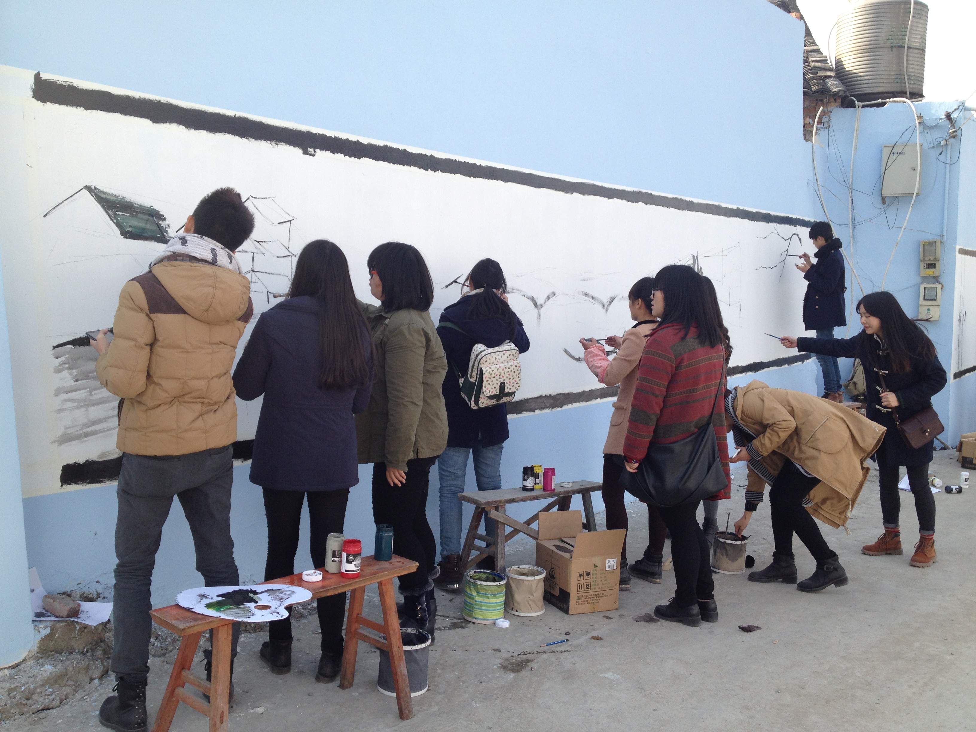 12月21日,阳光明媚,我院“艺家人”青年志愿者协会的志愿者们来到潘桥东边村参与“五水共治”墙绘活动。