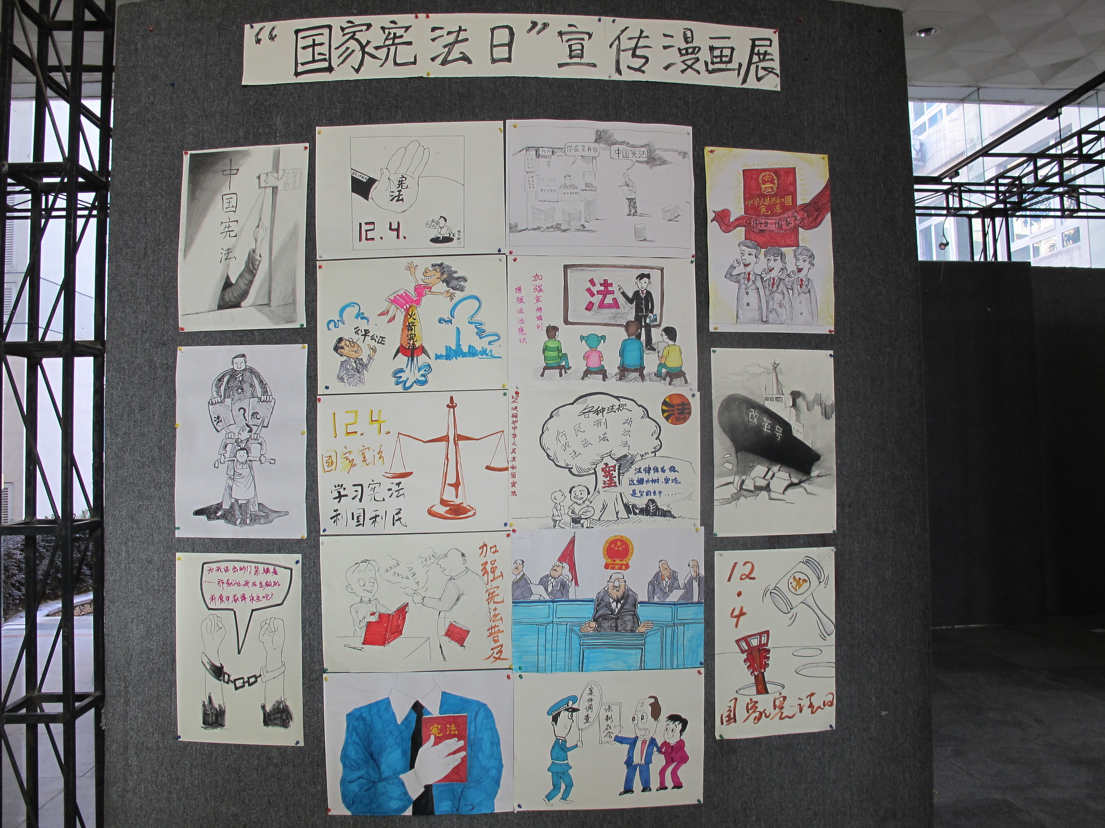 12月4日,为迎接我国首个“国家宪法日”,漫画柜 团委学生会的学生结合专业开展“宪法宣传漫画展”,以同学们喜闻乐见形式,向全院师生宣传宪法知识,呼吁大家要知法、学法、懂法、护法,维护宪法法律权威,从实践做起,从自己做起,从点滴做起。