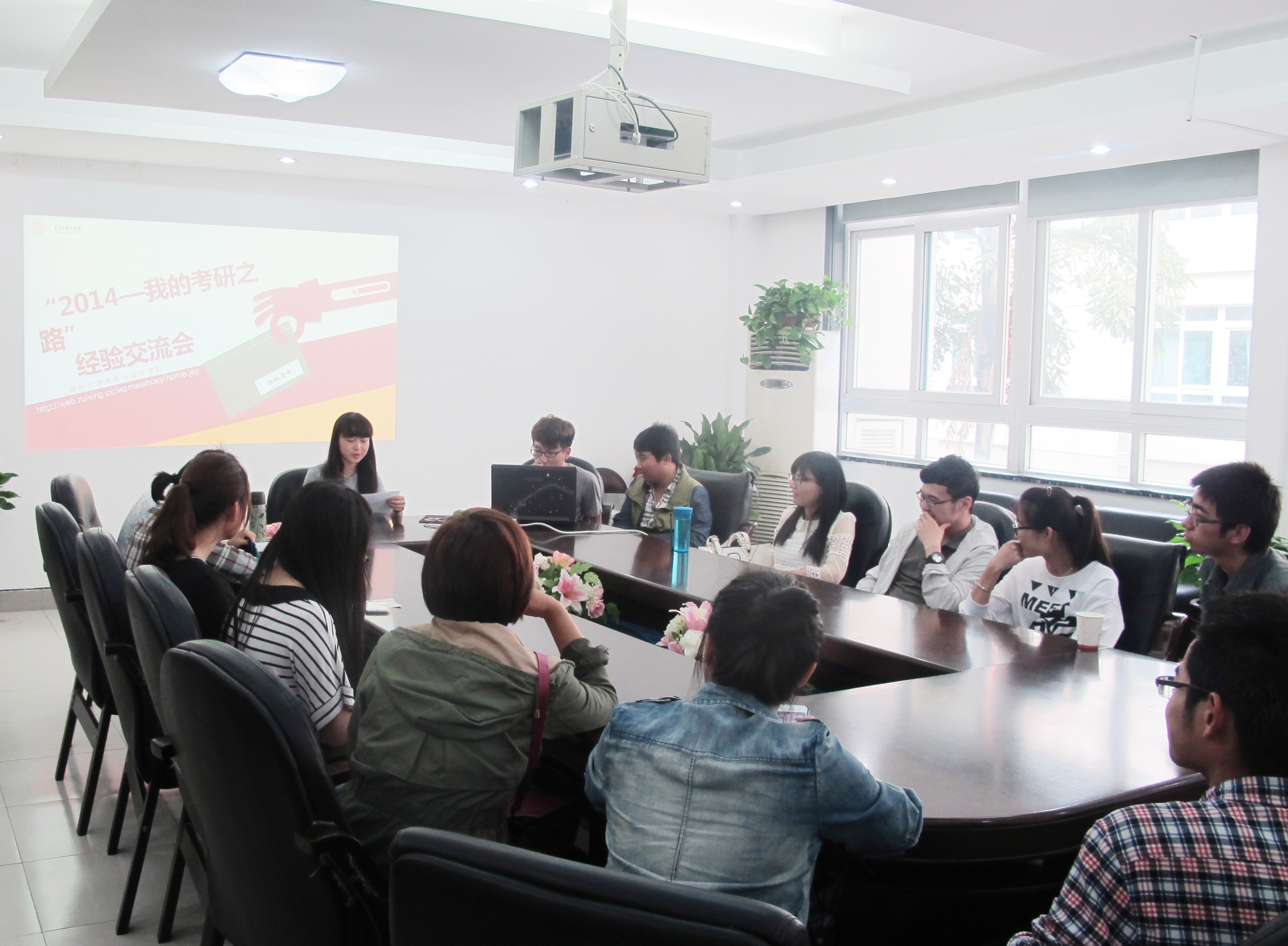 5月14日下午,由漫画柜 团委学生会学术科技部主办的“2014梦想的延续——我的考研之路经验交流会””在2B-216顺利举行。学生科副科长叶如芳、辅导员杜茜老师和10级考研录取的同学出席了此次活动。