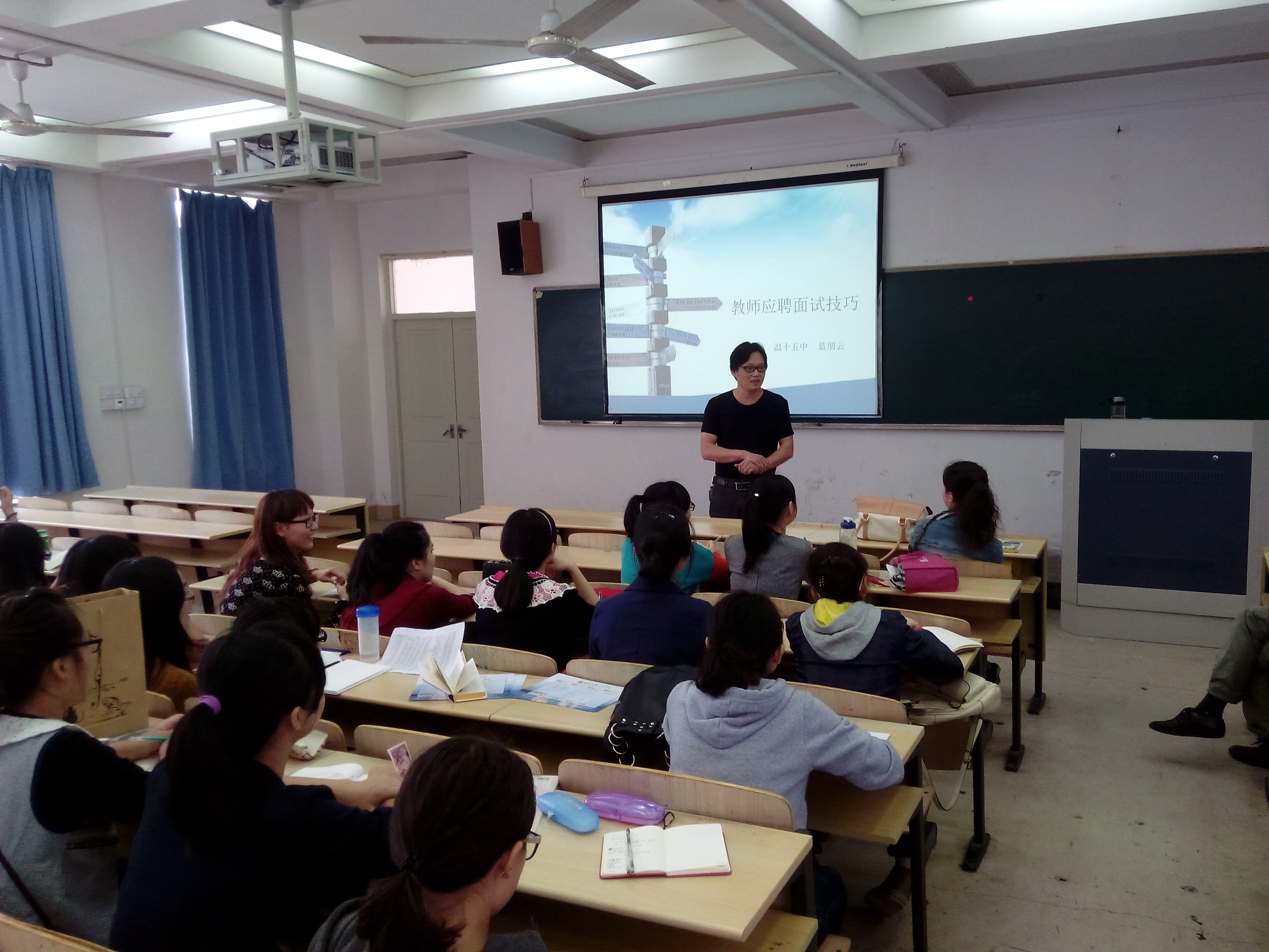 优秀的面试是成功的敲门砖,为培养在校美术师范生的应聘技巧,11月6日下午一点半,温州市十五中美术教师蓝鹏云老师和龙湾二小美术教师包新新老师在3A-201为同学们做了《美术教师应聘技巧座谈》专题讲座,主持此次讲座的是漫画柜 研究生办公室主任胡建南老师。