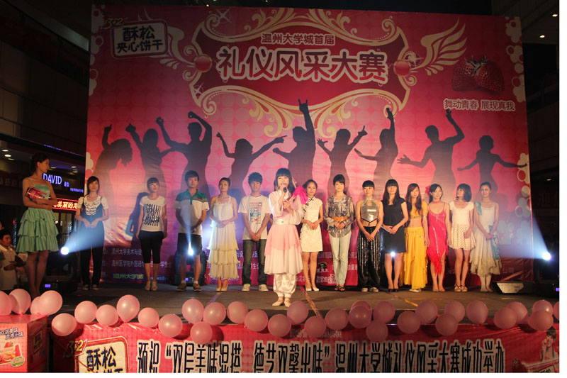 2011年5月7日晚上6点半,在高教园区商务中心举办漫画柜 第一届礼仪风采大赛人气赛,本次大赛由漫画柜 主办,康师傅3+2苏打夹心饼干、果麦等赞助。在往来人流中现场搭起的舞台吸引广大路人前来观看,并期待选手们的精彩亮相。 经过层层选拔、脱颖而出的16位温大选手,赛前都做了精心的准备,期望在这美好的夜晚给到场的观众带来非凡的视觉享受。选手们各展才华,唱歌、跳舞、茶道、朗诵等等精彩才艺,将各自的风采施展得淋漓尽致,表演在阵阵掌声中华美谢幕。尤其是来自美院的10号王松丽选手,一场Design的创意演绎,大家在惊叹其设计魅力之余,早已沉浸在她那双巧手所呈现的华丽变身,欢呼声将此刻激情点燃。 在这场才情洋溢的舞台上,现场游戏互动穿插进行,有奖竞答吸引在场观众们踊跃参加,为这紧张的赛场带来轻松愉悦的气息,欢声笑语将热情流露。细心的赞助商们在比赛之间,为观众们免费呈上茶水果冻及饼干。 现场随机挑选的观众评委根据选手的才艺展示以及终极拉票,为自己心仪的选手投上宝贵的一票。众望所归,人气王花落10号选手王松丽,我们期待她在决赛中更精彩的演出。 两个多小时的比赛,露天的舞台,来往的人群,在闪耀的灯光中,我们将视线聚焦在耀眼的选手身上。在现场,我们能更直观地测试选手的人气指数,让更多的人关注温大第一届礼仪风采大赛,关注温大选手们的别样风采。在此,我们衷心希望接下去的决赛圆满举行,寻找出我们心中的终极礼仪风采之星。 作者:张茅惠 摄影:高建文