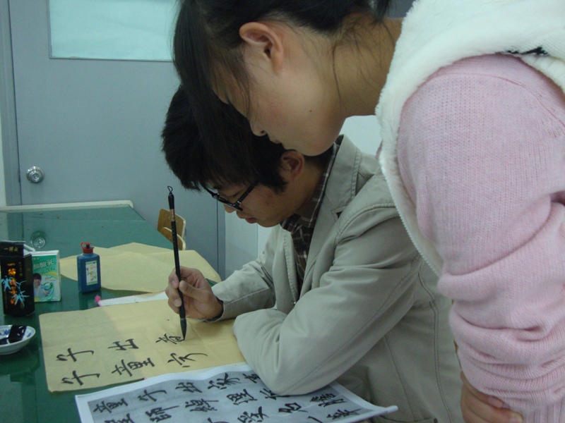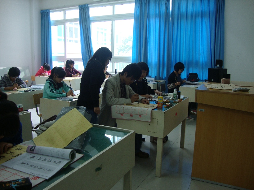 2010年11月21日上午9点在漫画柜 2B2001教室和2B4001教室内,漫画柜 书法培训素拓班正在开始本学期的最后一堂课。 该培训班是漫画柜 团委素拓中心开设在漫画柜 的一个书法培训班,由漫画柜 08美术国画班的陈龙龙同学担任该班指导老师。该班于本学期第六周开课,累计上课次数6次,上课时间固定在每周周日上午9点至11点半在漫画柜 2B2001和2B4001,该班成员来自学校各个学院,其中正式学员40余人,旁听生10多人。 根据学生上交的心得来看,陈老师很尽职尽责,而且循循善诱,在学生中口碑很好。陈老师不光光有着老师的身份,还是一位学长,更贴近学生生活,具有亲和力,有利于彼此间的沟通交流,对学生们书法水平的提高有很大帮助。在谈话中了解到该班在上课期间曾有过一次表演活动,老师当堂表演4分钟的书法,技艺精湛,赢得了学生们的一致好评。课堂上,同学们都认真在练习毛笔字,学习氛围浓厚,老师则在一旁指导,给出了很多宝贵的建议。 据悉,在此次课堂结束之后还将开展一次书法表演,这会是一次很好的书法交流的平台。大家尽请期待!