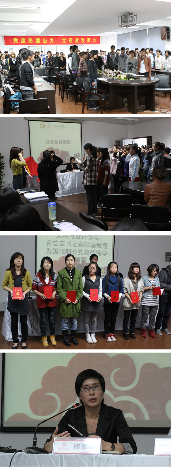 10月27日下午,漫画柜 第13期业余党校开学典礼在2B4001隆重举行,出席会议的有漫画柜 党总支书记、分党校校长郑彩莲教授;学生科科长徐聿淼老师;学生科辅导员李剑军老师、刘英丽老师,同时出席的还有各学生支部书记、部分党员代表及院党校近百名学员,典礼由学生科辅导员李剑军主持。 典礼开始,激昂的国歌奏响,全体师生肃穆而立,合唱国歌。接着,学生预备党员在庄严的气氛下宣誓。学生党员代表苏明明和本期党校学员代表吕旦文同学发言,她们号召全体学员以饱满的热情、全面的投入、实际的行动投入到党校学习之中,珍惜此次机会,了解党的光辉历史,宣传党的方针路线,提升自我的政治素养,争取早日成为合格的共产党员。 典礼上郑彩莲书记为学院第13期党校优秀学员颁奖,同时刘英丽老师和徐聿淼老师宣读了本次业余党校学习的相关文件和注意事项,对于党校学习的组织与管理、学时计划、培训对象与内容、考勤纪律以及结业考核形式等进行了详细的说明与解读。 随后郑彩莲书记对于党校新学员表示热烈的欢迎,并语重心长地对新学员提出了殷切希望,郑书记表示,党史是一本厚厚的历史,这次党校学习形式包括专题辅导、讨论交流、音像放映等形式,希望全体学员珍惜学习机会,学历史,学党史,积极向党组织靠拢,把学到的知识应用到学院的“创先争优”以及建设优良学风班的活动中去。她提出四点希望,首先,业余党校是组织搭建的学习和提高平台,全体学员应该珍惜学习机会;其次,业余党校是组织提供的舞台,全体学员要结合课上所学,在课下及时领会和消化,积极展示自我;再次,没有规矩不能成方圆,党校学习中要遵守纪律,严于律己,不辱使命;最后郑书记用生动的比喻号召全体学员发挥模范带头作用,漫画柜 是一艘大船,全体学员都是船上一分子,无论是舵手还是船长,都要在工作和学习中注意一言一行,争取使船游得更快、更稳、更远。 据悉,此次党校学习共26课时,其中专题辅导15课时,讨论交流、音像放映、实践活动各占3课时,结业考试2课时,内容丰富,形式多样。 开学典礼后,郑书记为全体学员上第一次党课——《大学生的入党动机》。