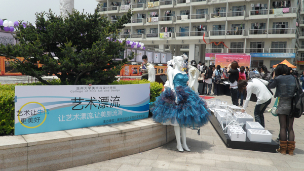 2010年4月28日对同学们来说是再普通不过的日子,与往常一样的早起赶上课、下课冲食堂。然而今天,许多同学却停下了匆匆的脚步,被一些创意独特的鞋靴、服饰等吸引,纷纷驻足在温大生活区A区,欣赏由温大漫画柜 主办的“艺术漂流”巡回展览。