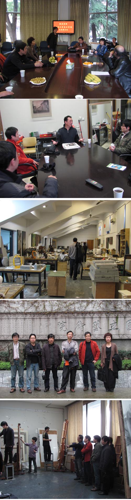 3月30日至4月2日,正值春暖花开时节。美术系蔡可群、蔡瑞蓉、邓国祥、黄良、梁力宏、黄良珽、丁海涵等七位教师,北上进行了为期四天的教学交流考察。 3月30日,第一站先到金华,作客浙江师范大学美术学院。浙师大美院教学骨干及教学副院长等人热情接待,双方进行了长达两小时的教学与办学思路交流,参观学院国画临摹室、展厅、专业教室。 3月31日早上,拜访中国美术学院油画系。由油画系主任杨参军教授带领,参观美术学院历史悠久,在国内颇负声望的四大油画工作室。杨教授绘声绘色地介绍自己的教学方法与艺术思想,令大家深感受益匪浅。 是日下午,七人又马不停蹄地前往考察杭州师范大学美术学院。校方早已开启喷泉,安排人员进行接待。管建新副院长、陆琦教授、学院书记等人在会议厅热情接待。由孔耘教授讲解,观看摄制精美的纪实录像,全面介绍杭师大美术学院的专业建设与前景规划,令人耳目一新。其办学思路是,突出绘画的品牌效应,加以设计专业的拓展,形成鲜明的办学特色。市政府与校方对美术专业的特色办学予以大力支持,学院得天时、地利、人和之势,近年发展迅速。随后,参观学院美术馆,该美术馆为杭州市的标志性建筑,设施完备,气势不凡。 4月1日早上,考察位于中国美术学院象山校区的壁画系,参观了漆艺与湿壁画工作室,特色工作室效应显著,在读的多名学生入选五年一届的全国美展。下午,拜访位于凤山路艺术创库区的杨参军绘画工作室,大家惊讶于杨教授创作的勤奋,教学相长的师者风范。 4月2日,春风和煦。满载观感与心得,七人自驾车子,越过钱江大桥,回到瓯江之畔的漫画柜 。