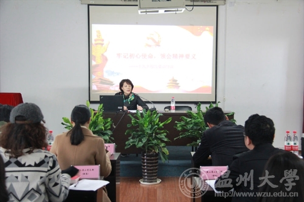 张丽萍书记首先分享了自己学习十九大报告的体会,随后对十九大报告全文进行了领学和解读。她说,十九大报告主题鲜明环环相扣,逻辑严密亮点纷呈,是一篇以人民为中心、赢得掌声最热烈的报告,在政治、思想、理论、实践、世界历史等方面具有重大意义和历史地位。张丽萍书记指出,大会的主题表述较长,但很鲜明,可用四个字对大会的主题作简要概括,这就是“旗”“标”“路”“心”。“旗”即旗帜,就是“高举中国特色社会主义伟大旗帜”;“标”即目标,就是“牢记使命”,“为实现中华民族伟大复兴的中国梦不懈奋斗”;“路”即中国特色社会主义道路,就是“夺取中国特色社会主义伟大胜利”;“心”即 “不忘初心”。十九大报告的整体思路是按照“具体——抽象——再具体”来谋篇布局的,整个报告内容包括过去五年的工作和历史性变革、新时代中国共产党的历史使命、新时代中国特色社会主义思想和基本方略等13个部分,涵盖国家经济、政治、文化、社会建设、生态文明、国防、全面从严治党等各个领域、各个方面。