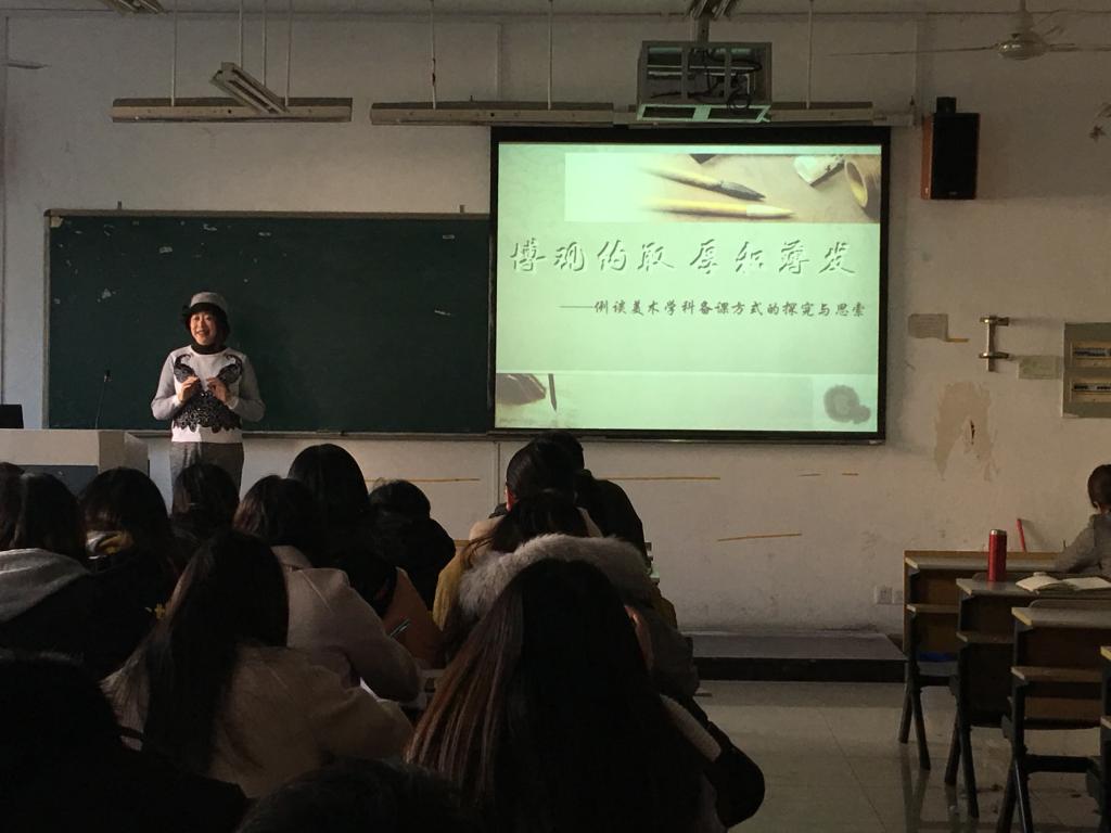 本次研讨给同学们带来极大震撼,使同学们认识到深入的钻研教材的重要性。首先,金瓯老师围绕如何深入的钻研教材,通过引案例、与同学间的互动、点评并结合自身经历为同学们分析了上好一节美术课的前提,用幽默风趣的语言向同学们提出了相应的的解决方法,提出了备课前三步走的工作思路和具体的备课过程。整个教室不时发出清脆动听的笑声,同学们在轻松的氛围中认识到深入钻研教材的重要性。她还对同学们提出了深入钻研教材备课的建议,对同学们寄予了殷切的期望,同学们以热烈的掌声欢送金鸥老师离场。