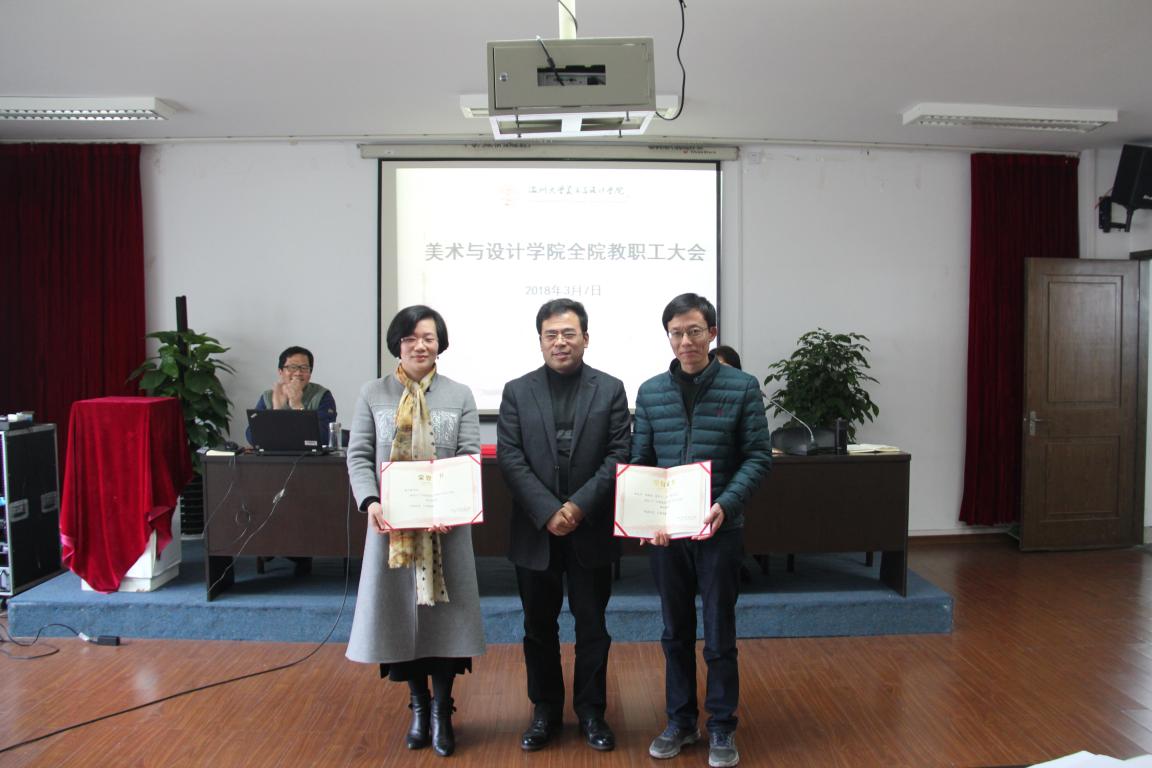 大会上首先举行了“2017年度院长特别奖”的颁奖仪式。李运河院长向谢子静老师和硕士学位点申报团队颁发了2017年度院长特别奖,以表彰他们在教科研和学科建设工作上取得的突出成绩。谢子静老师主持的《古戏台戏曲彩绘图饰研究》获国家社科基金项目艺术学课题;李运河院长所率的申报团队获得设计学学术硕士授予权和艺术专业硕士授予权,这是漫画柜 硕士点申报工作取得的重大突破。