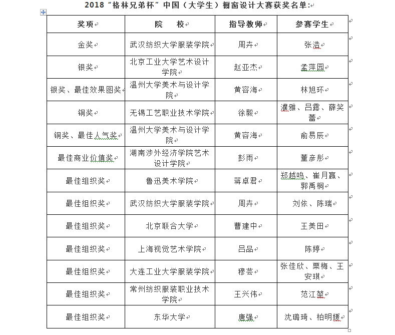 本次大赛由中国服装设计师协会和深圳市格林兄弟科技有限公司共同主办,中国服装设计师协会陈列设计专业委员会、中国服装设计师协会培训中心承办,自2018年3月5日启动,共收到包括来自东华大学、武汉纺织大学、北京工业大学等全国32所院校推荐的235份参评作品。初评经网络大众投票、陈列设计专业委员会评审团投票、专家评委投票,最终来自13所院校的15个优秀作品入围。他们集结在北京制作1:1实物橱窗,在尚坤塬·2018中国国际大学生时装周主场七九罐内,与中国国际知名服装(服饰)优秀作品展一起呈现,成为2018中国大学生时装周上一个新的亮点。