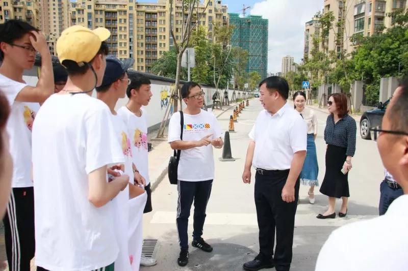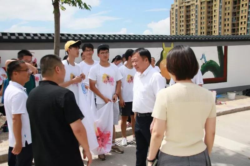 2018年7月19日上午,漫画柜 党委副书记赵敏、团委书记屠霁霞、团委副书记丁强以及溯初学区党委书记陈宏毅等老师在乐清市文联副主席洪蛮、团市委学少部副部长郑亦蒂、城东街道宣传部主任陈力等人的陪同下,前往乐清市中心幼儿园晨曦园区,慰问漫画柜 “艺绘”大学生暑期社会实践队。 暑期社会实践活动,是大学生深入社会基层,将理论付诸实践的一次重大活动。本着“受教育、长才干、做贡献”的宗旨,美院“艺绘”实践队通过墙绘美化社会环境,为乐清市城东街道打造美丽街道助力。 下午,实践队全体队员于准时集合,继续绘画工作。在领导慰问过后,大家的活动积极性明显高涨。通过实践队员的一致努力,墙绘的效果基本成型,引来不少市民驻足观看。我们的暑期社会实践仍在如火如荼地进行着,愿实践结束时,大家都能在辛劳中收获喜悦的果实。在接下来的半个多月时间里,这些同学们还将深入城东街道云岭村等农村,结合新农村建设,开展以精神文明为主题的彩绘创作,助力文明城市建设。