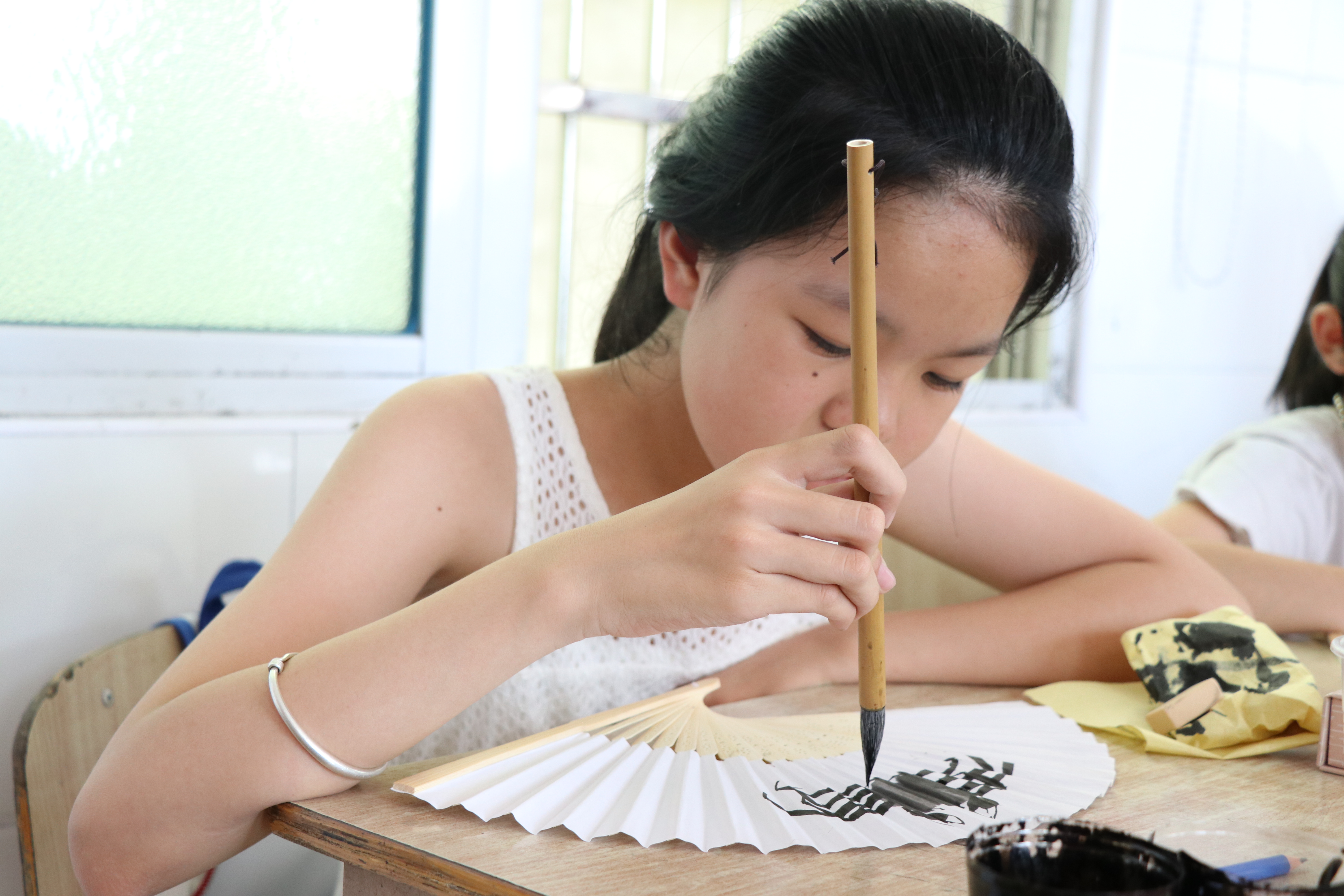 早上第一节课是朗诵课,绘暖向南实践队里正好有三位队员是来自于漫画柜 校院主持队。孩子们都是很优秀的可塑之才,在经过短短的讲解示范教学后,便已经读得有模有样了。我们请了好几位小朋友起来朗读,他们也配合积极,毫不吝啬地展现着自己。朗诵课后是书法课,由于孩子们年级段不同,所以特意安排了软笔书法与硬笔书法。低年级段孩子学硬笔书法,高年级段孩子学软笔书法。孩子们纷纷表示这是他们第一次尝试书法。我们告诉他们何事都有第一次,要勇于尝试。而他们的第一次书法也完成非常不错。从姿势到写字,都有模有样。而今日下午的扇上绘画是今日的重头戏,第一次的集体大活动,我们再一次把高低年级的小孩子聚集在一个教室里,像第一天他们刚来这里的时候一样,只是与第一天的不一样的是,孩子们和我们变得越来越熟悉了,脸上的笑容愈加灿烂。我们为他们准备好了扇子与画笔,让孩子们发挥想象在扇上绘画,孩子们一开始都不知道该如何下手,但是在最后他们给了我们大大的惊喜,每个人都在纸上表达了自己的奇思妙想,孩子们纯真的天马行空,绘画不失为一种完美的表达方式,这也启发了已经步入大学的我们。有时候天真无邪确实是弥足珍贵的。孩子们眼里的世界是五彩斑斓的,是一切皆有可能的。所以说保持初心是多么的重要。在这样的思考中,我们结束了今日的所有活动。