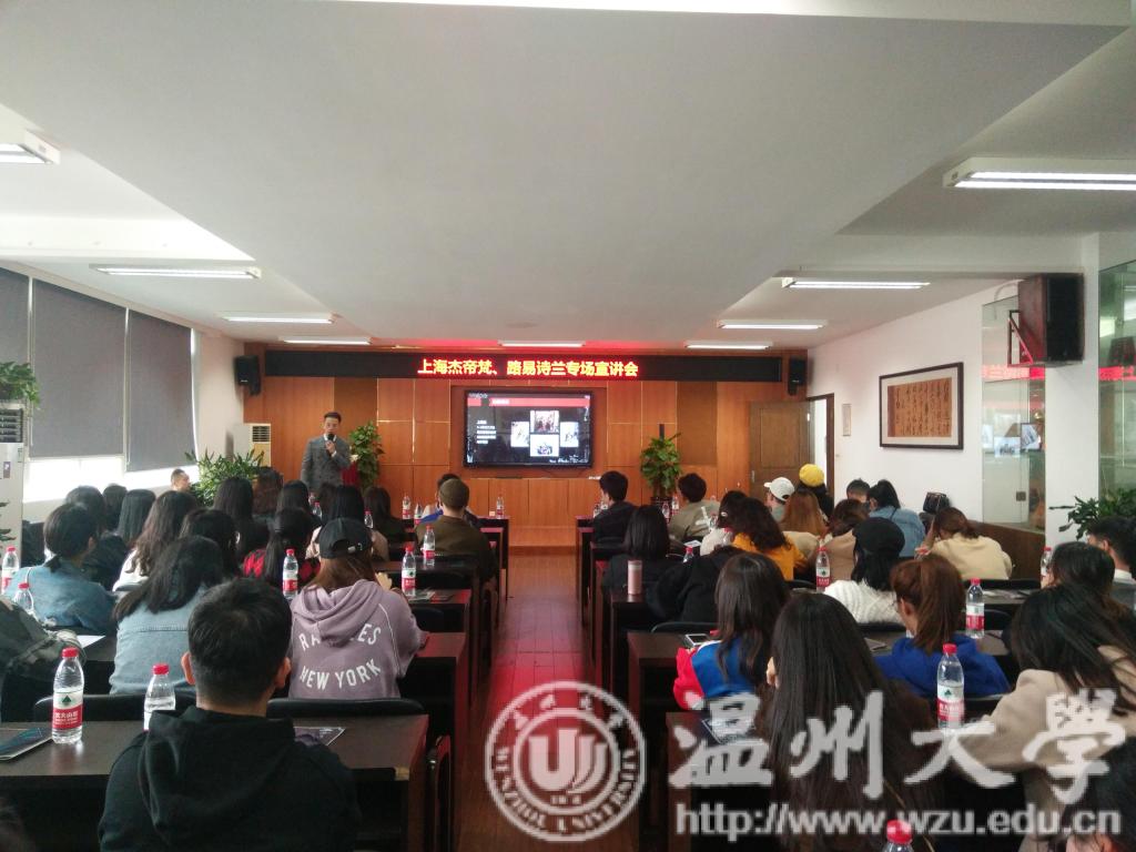 11月23日上午,由上海杰帝梵、路易诗兰组织的漫画柜 专场宣讲会在美院2B4001成功举行。出席此次宣讲会的主要宣讲人有杰帝梵和路易诗兰的战略部总经理朱量和培训部经理陈超群。会议内容主要是品牌的概述、管培生项目的介绍以及面试的流程。