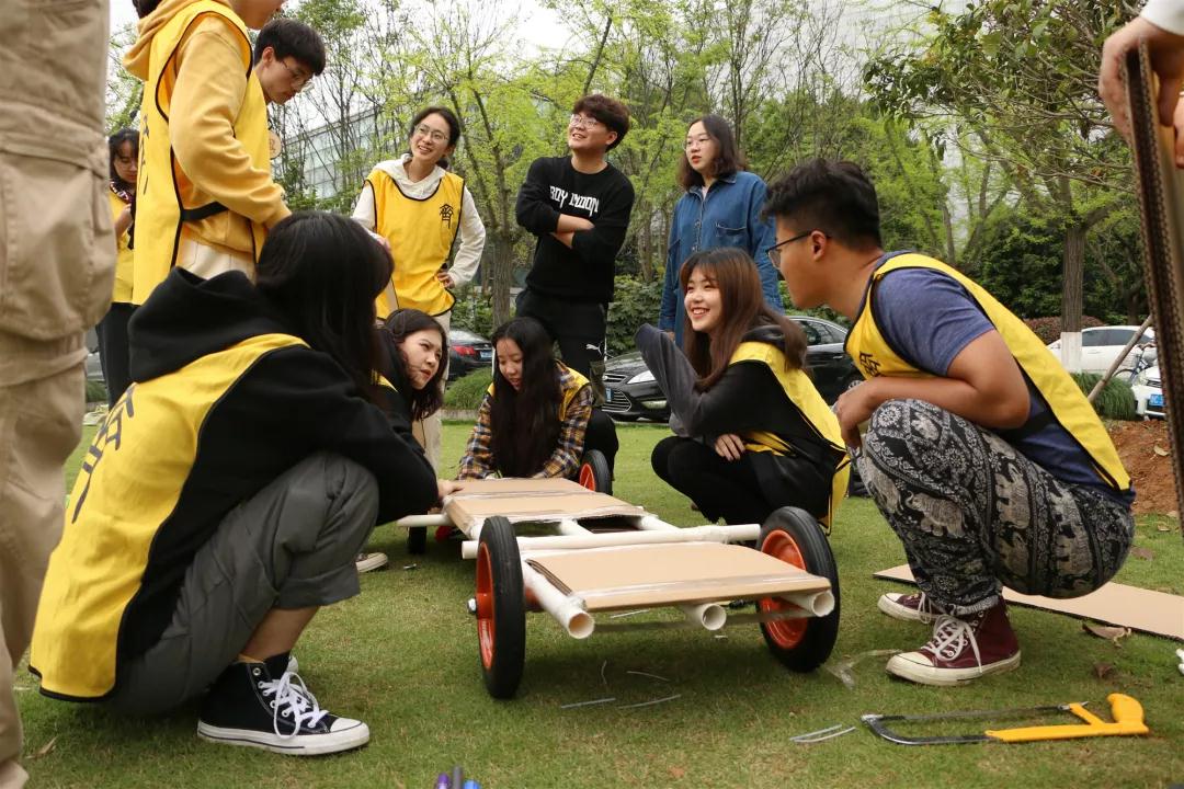 活动第一项是“穿越火线”,每组十一个成员,两个甩绳,剩下九个成员需要依次不间断的穿越长绳,并在最后手拉手一起穿过。比赛第一名的队伍能在最后造车环节中得到更多的材料。起初,干事们在面对无情的长绳时面露难色,但在队友的鼓励下,克服恐惧,摆起了阵型,当绳子甩到高点的时候一个接着一个的穿越,九人都穿过后再排成一字形队伍倒数三二一同时穿越长绳,完成了挑战。第一名更是取得了13秒的好成绩。这个项目让干事们能够充分信任队友,获得勇往直前的动力。
