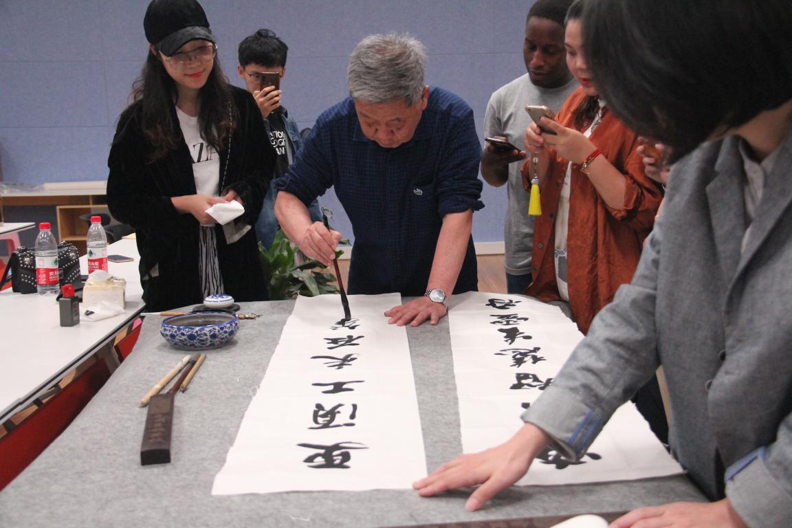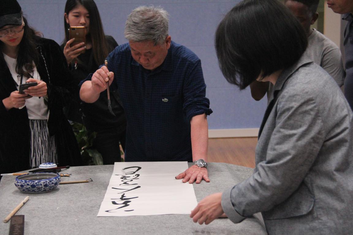 讲座结束后,马亦钊老师现场挥毫泼墨,创作出一幅精美的书法作品赠送给漫画柜 ,李运河院长和张丽萍书记接受赠送并做答谢。