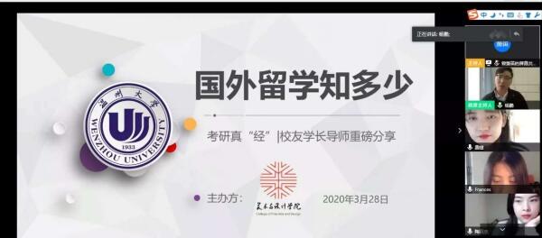 疫情不是暂停键,成长指导全在线。一个多月时间以来虽然“开学不返校”,但是245名本科毕业生的就业工作一直让漫画柜 的老师们牵挂不已,尤其是对于学院立志考研和准备出国的学生,如何帮助他们顺利实现梦想?为了更好地指导学生学习规划和考研升学,近日,漫画柜 在“云端”组建了一个实力不容小觑的导师团,聘请8位优秀校友担任“考研(留学)校友学长导师”,并且连续举办了2场“云”端传送考研(留学)真“经”的活动,参加学生近200人次。 “我最大的感受是如果准备出国留学,语言沟通能力是很重要的,这方面要付出较多的精力,另外就是要确定好自己的目标,选择哪个国家的哪所大学以及学什么专业,目标确定了以后才能走得更快更远!”目前正留学意大利罗马第一大学的陶夏欣学姐这么说。 “选择考研一定要走出自己的舒适圈,你可以去图书馆、去学校考研教室,尽可能不要呆在寝室里;如果你够自律,你可以一个人学习,如果你觉得自己不够自律,最好选择一个考研的小伙伴一起努力。”在浙江理工大学读研的学长许金智这样鼓励学弟学妹。 在学院精心安排的 “国外留学知多少”留学专场交流会和“国内院校备考攻略”国内考研专场交流会上,八名导师精心准备、重磅分享自己的申请出国读研和国内考研的宝贵经验和心得,也收获了学弟学妹的诸多点赞。受聘为“留学校友学长导师”的三位校友,分别是留学意大利罗马第一大学的陶夏欣、留学韩国梨花女子大学的费婕和留学澳洲昆士兰大学的杨凡,在当前疫情严峻的留学境况下,她们克服距离和时差上的影响,精心准备,从留学生活、留学优势、留学申请经验和注意事项等方面为同学们提供了有益的经验,他们也分别担任温大美院学子在欧洲、韩国、澳洲的留学校友学长导师,为日后有留学意向的同学提供更多的渠道和联络指导帮助。 五位来自杭州师范大学、浙江理工大学、漫画柜 的校友学长导师,则从备考规划、择校攻略、复试和调剂等多方面为意向考研或正在准备复试调剂同学在云端奉送了宝贵的实战经验。浙理工校友杨怡洁还在线上赠送了自己珍贵的考研资料,并展示了自己复试时做的“研究生个人规划”;浙理工许金智、杭师大金佳吉两位校友从专业绘画作品集的积累方面给考研和复试同学支招;2位来自本校的研究生陈嘉怡、曾箫笛为同学们传授了“调剂攻略”。 8位“校友学长导师”,在疫情防控形势下,国际国内4地连线,2场“云”端分享,满满的干货经验,助力考研留学学子成长发展需求,用最直接的经验为他们引航考研留学之路。8位“校友学长导师”受聘1年,仍将保持“云”端在线,继续为学弟学妹提供指导和帮助。 据悉,漫画柜 毕业生升学率逐年增长,2019年成功申请国外知名学府留学6人,国内重点院校考研升学12人。2020报名参加研究生考试近50人,占本科毕业生总人数近1/5,目前正在准备考研复试和申请出国的同学近30人。针对目前疫情形势下学院考研留学情况,漫画柜 党委副书记杨丽君表示,学院将多措并举,出台更多的考研留学新“政”,集聚更多的资源和力量,来帮助和指导有意考研和申请留学的学子,为他们提供更多“好平台、好经验”,助力他们实现“研”途梦想。