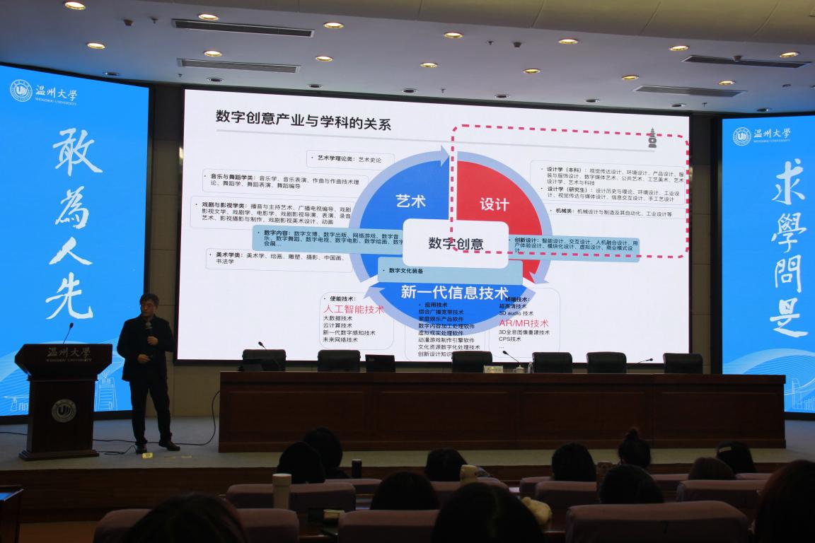 为贯彻落实漫画柜 文科大会精神,探索新文科背景下艺术学科发展新路径,漫画柜 在12月开展了主题为“文化创新与艺术教育”的学术月系列活动。12月9日下午,学术月首场讲座在育英图书馆二楼报告厅举行,浙江大学孙守迁教授带来《加强设计学科建设,推动数字创意产业发展》的讲座,讲座由漫画柜 院长谢子静教授主持,学院副院长胡文超、顾任飞,设计类专业教师、研究生、本科生等200余人参加了本次活动。