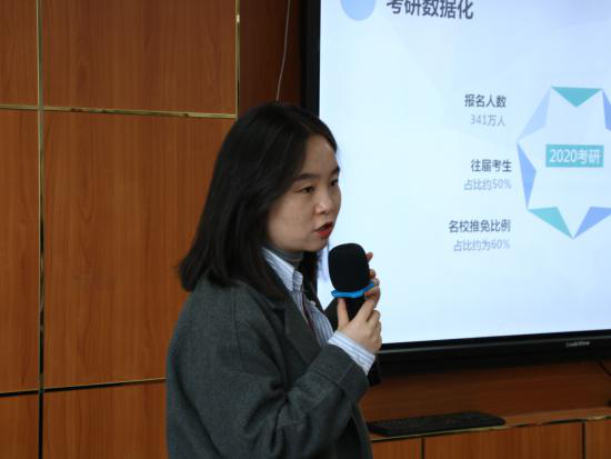 讲座正式开始前,会场已经座无虚席,同学们十分热情,会场气氛高涨。在主持人简单的介绍后,中公考研的张文岐老师站上讲台,先对现场同学的专业进行提问,大致了解以后开始分专业精确指导。