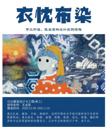 2020年12月29日,由王业宏老师指导的18服装设计与工程(卓工)班手工印染、服装面料设计课程展——“衣忱布染”在漫画柜 B楼大厅举行。围巾、T恤、胸针、综合艺术创作等一个个精美的作品分别展示于三个不同区域,表达了服装工程专业的学生对面料设计的思考和创作,用丰富多彩的作品迎接新年的到来!