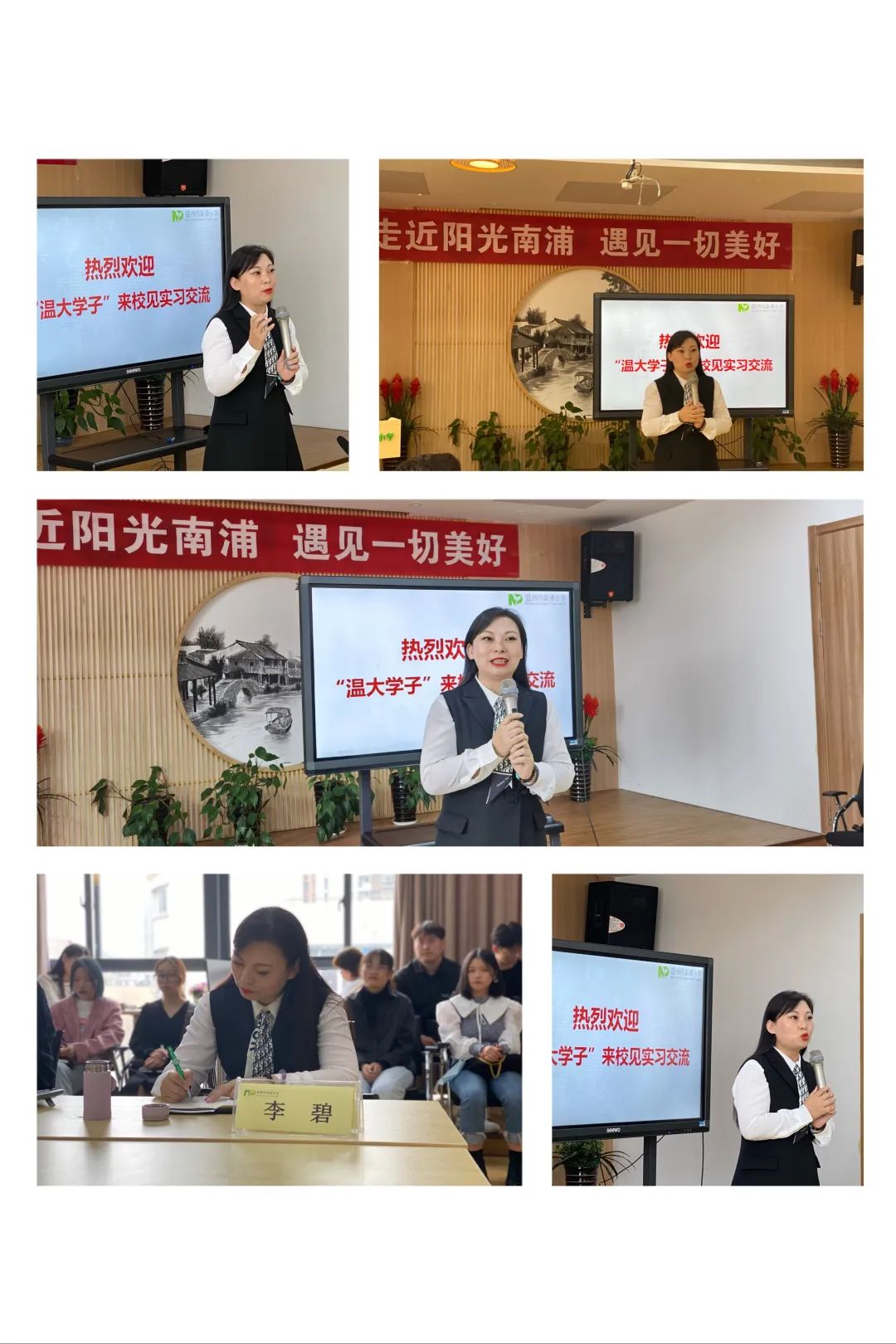 首先,温州市南浦小学副校长陈民良老师致辞欢迎,并就温州市南浦小学的办学理念、学校概况及研训特色等做了详细介绍,他指出学校研训从“做细主题研训,从常态寻求问题,在问题中提炼主题”、“做实教研月,发挥团队精神,提升专业修养”、“做活“互联网+”学习前沿技术,探索未来教育”等几个方面落实,致力挖掘学生潜能,实现教师教育梦想。同时希望见习生能够虚心向指导老师学习,多与指导老师沟通,练就一身扎实本领。