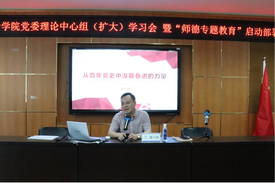6月16日下午,校党委委员、宣传部部长潘玉驹教授以《从百年党史中汲取奋进的力量》为题为漫画柜 师生党员上专题党课。潘委员从中华民族的历史史册开篇,带我们重温半条棉被、抗日英雄杨靖宇等党史故事,回顾中国共产党传奇的建党历程,指出我们党的光辉百年,是矢志践行初心使命的一百年、是筚路蓝缕奠基立业的一百年、是创造辉煌开辟未来的一百年。潘委员强调,中国特色社会主义进入新时代,中华民族伟大复兴曙光在前、前途光明,但也面临着严峻挑战,在这个关键当口,全体师生要以史为镜、以史明志,增强历史自觉,激发为实现中华民族伟大复兴而奋斗的信心和动力,做到“六个进步”,以昂扬姿态奋力开启全面建设社会主义现代化国家新征程,以优异成绩迎接建党一百周年!