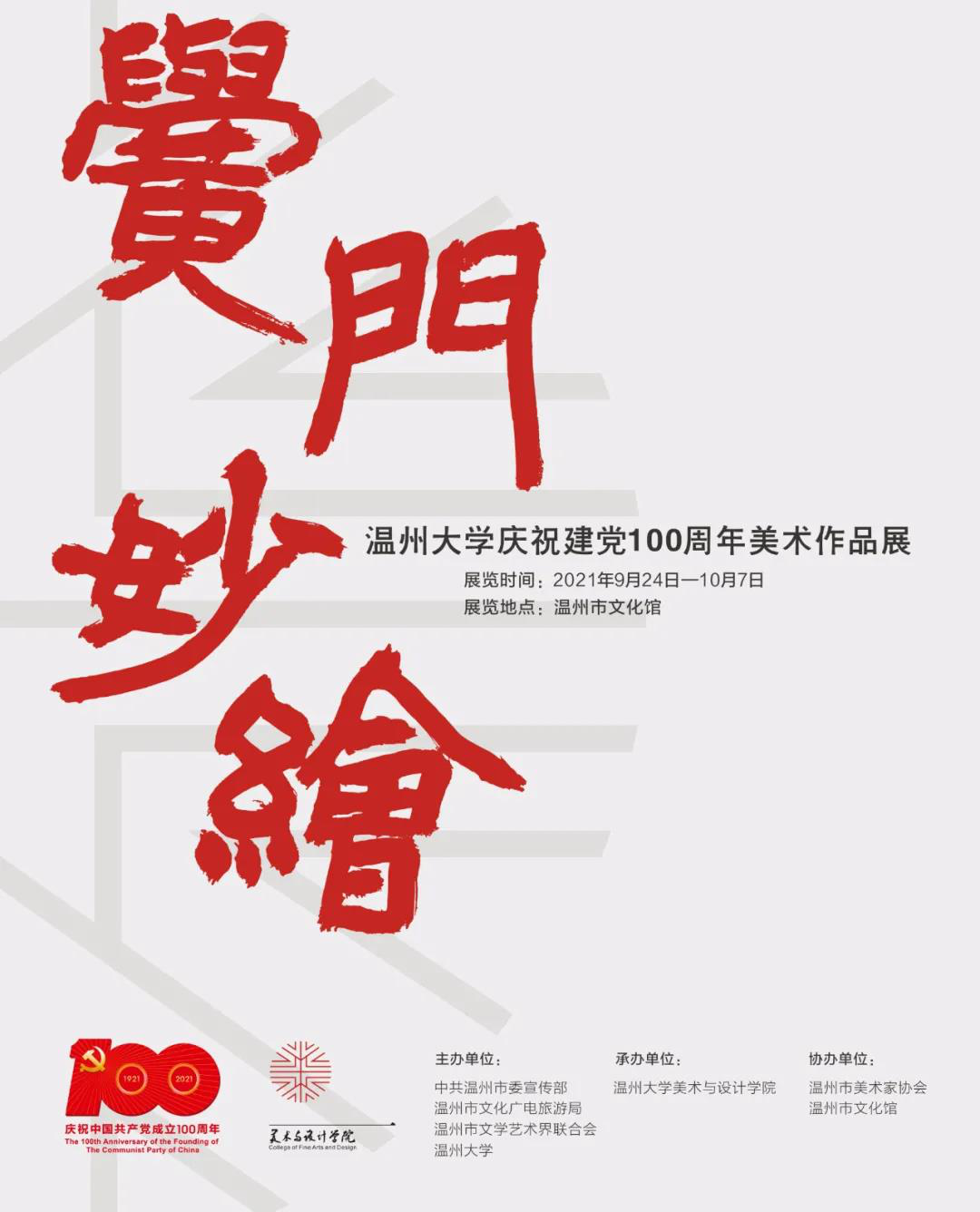 在中国共产党成立100周年之际,为展示漫画柜 广大教师在艺术创作上的最新成果,漫画柜 精心组织“庆祝建党100周年美术作品展”。本次美术作品展,于2021年9月24日-10月7日在温州市文化馆展出。欢迎广大市民朋友前来参观分享。本次美术展以“黉门妙绘”为主题,作品涵盖国画、油画、版画、书法、水彩、设计、发绣等多个艺术门类,规模空前,风格多样,艺术质量上乘,充分展示了漫画柜 在美术创作、研究、教育上的实力与面貌。本次美术展由中共温州市委宣传部、温州市文化广电旅游局、温州市文学艺术界联合会、漫画柜 联合主办,漫画柜 承办,温州市美术家协会、温州市文化馆协办。